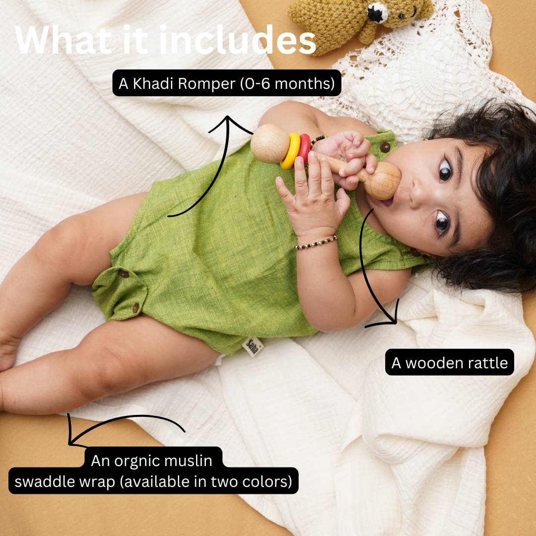 Earth Baby Gift Set – A Thoughtful Embrace for New Beginnings Looking for meaningful and sustainable newborn baby gifts? The Earth Baby Gift Set is a lovingly curated bundle of comfort, care, and conscious desig, making it one of the best newborn gifts for new parents. This beautiful newborn gift hamper includes: A soft, breathable Khadi romper, crafted from handspun, GOTS-certified organic cotton - gentle on newborn skin and naturally hypoallergenic. A luxuriously light muslin swaddle, made from GOTS-certified organic cotton to wrap your baby in soothing softness. A handcrafted wooden rattle that offers safe sensory stimulation and encourages early motor development. Every element of this baby gift set has been carefully selected to support the well-being of both baby and planet. It's an ideal choice for newborn presents, baby showers, and anyone looking for eco-conscious newborn gift ideas.