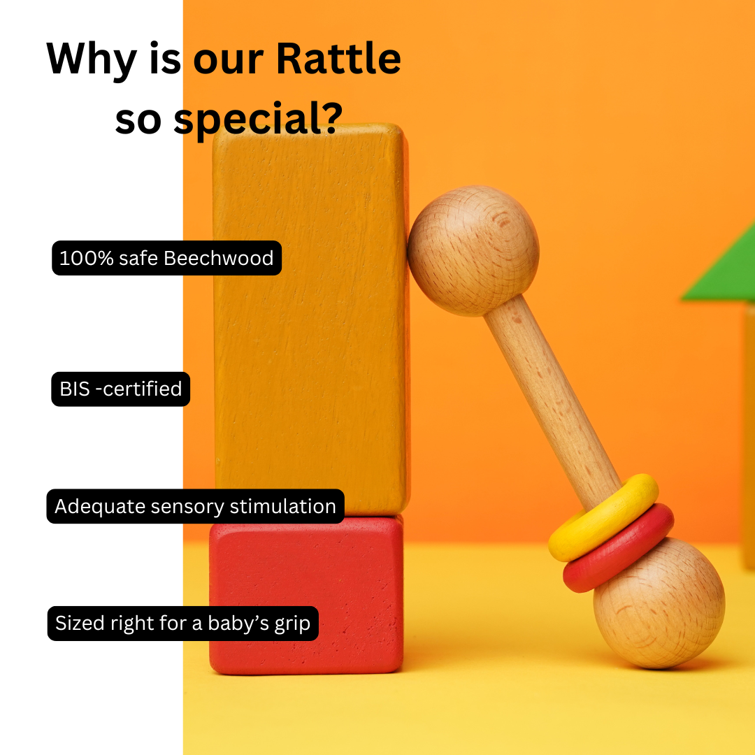 3. Eco-Conscious & Handmade The wooden rattle is handcrafted from sustainably sourced wood, polished smooth for tiny hands. No plastic, no toxins - just pure, safe play. Still curious? Read the blog post to understand the gift box better!