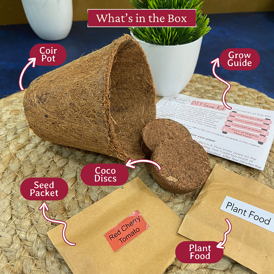 The kit contains: 1 coir pot, 1 packet of seeds, 2 Coco Coir Discs, Plant Food & User Manual