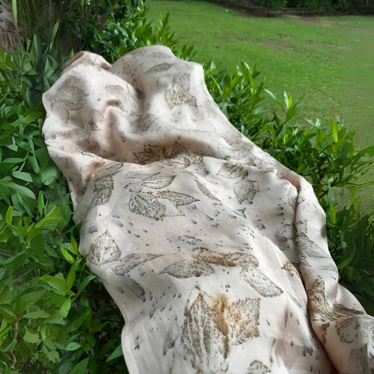 A handcrafted bandana dyed with foraged leaves through eco-printing. Subtle blush tones meet nature's textures in this wearable piece of art. No bleach or dry clean—only gentle, cold water care.