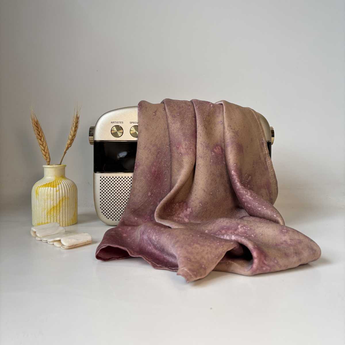 A soft blush bandana naturally dyed with handpicked leaves using the eco-printing technique. Each piece is uniquely imprinted by nature, showcasing organic patterns and earthy tones. Made with care, meant to be worn mindfully. Avoid dry cleaning or bleach to preserve its natural beauty.
