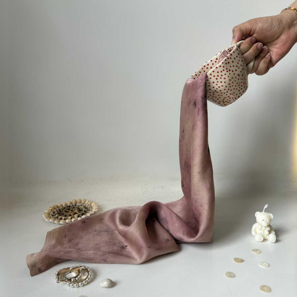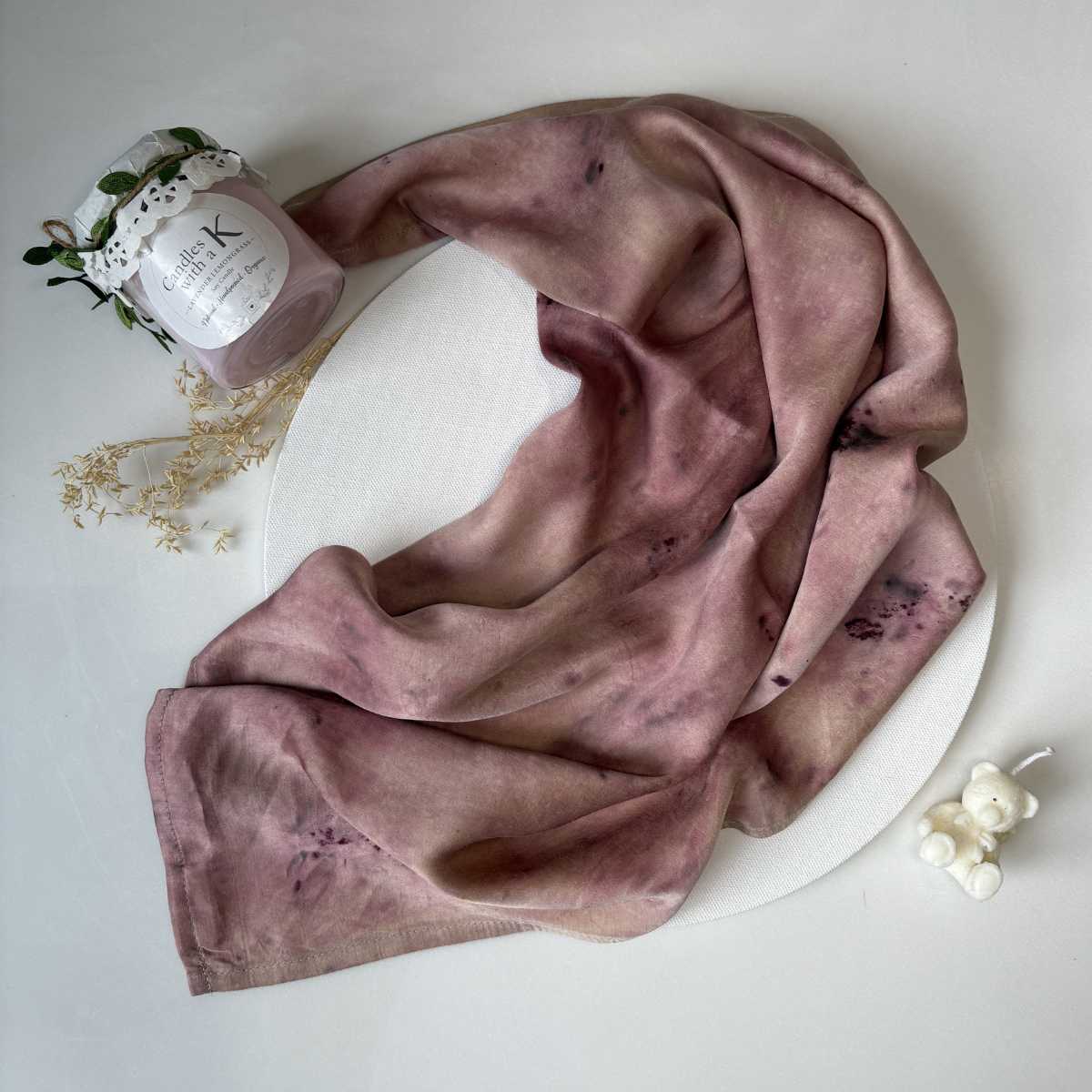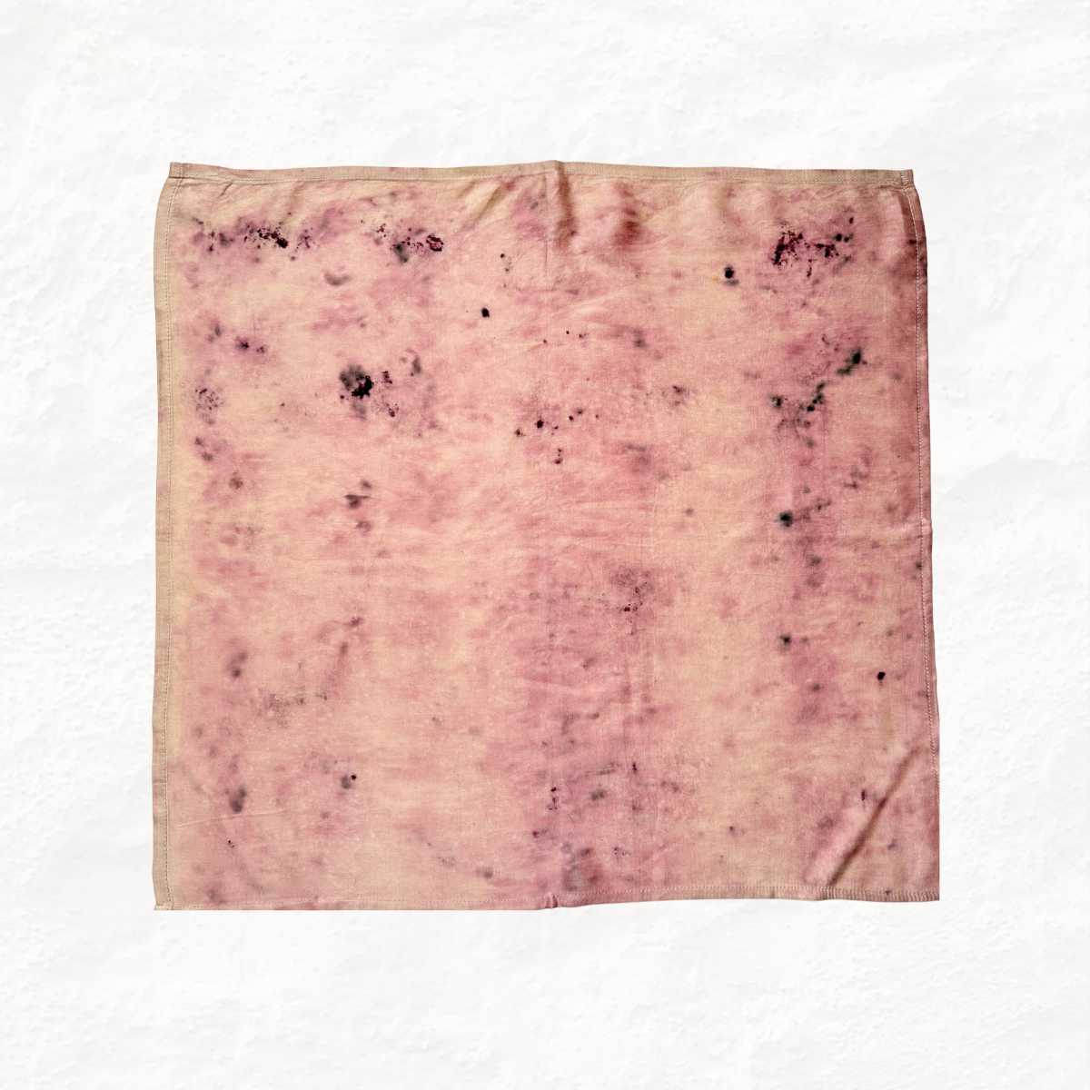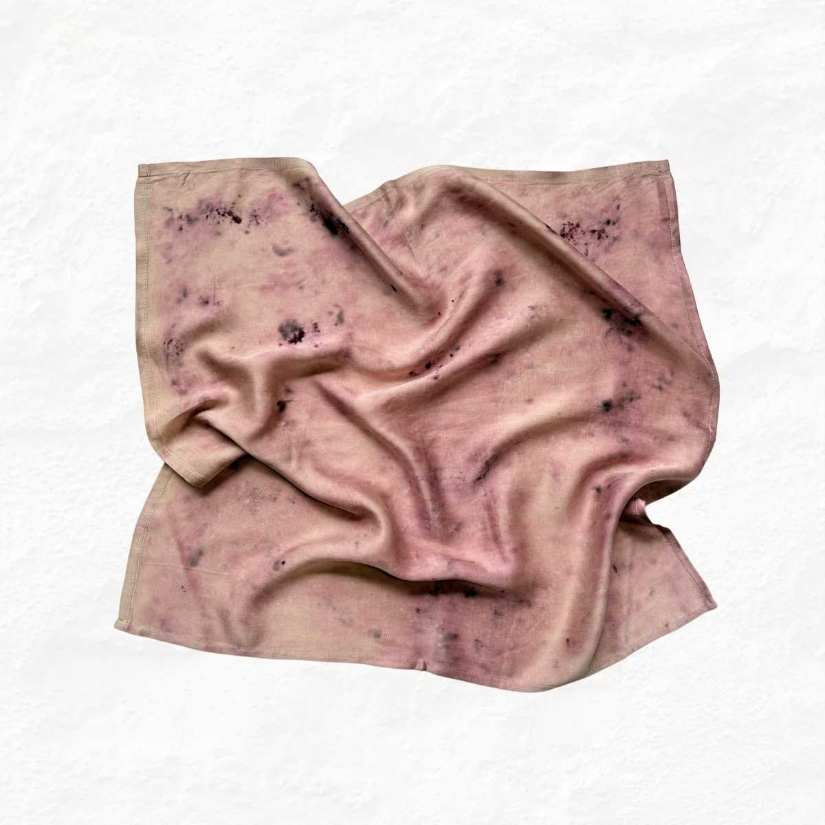 A handcrafted bandana dyed with foraged leaves through eco-printing. Subtle blush tones meet nature's textures in this wearable piece of art. No bleach or dry clean—only gentle, cold water care.