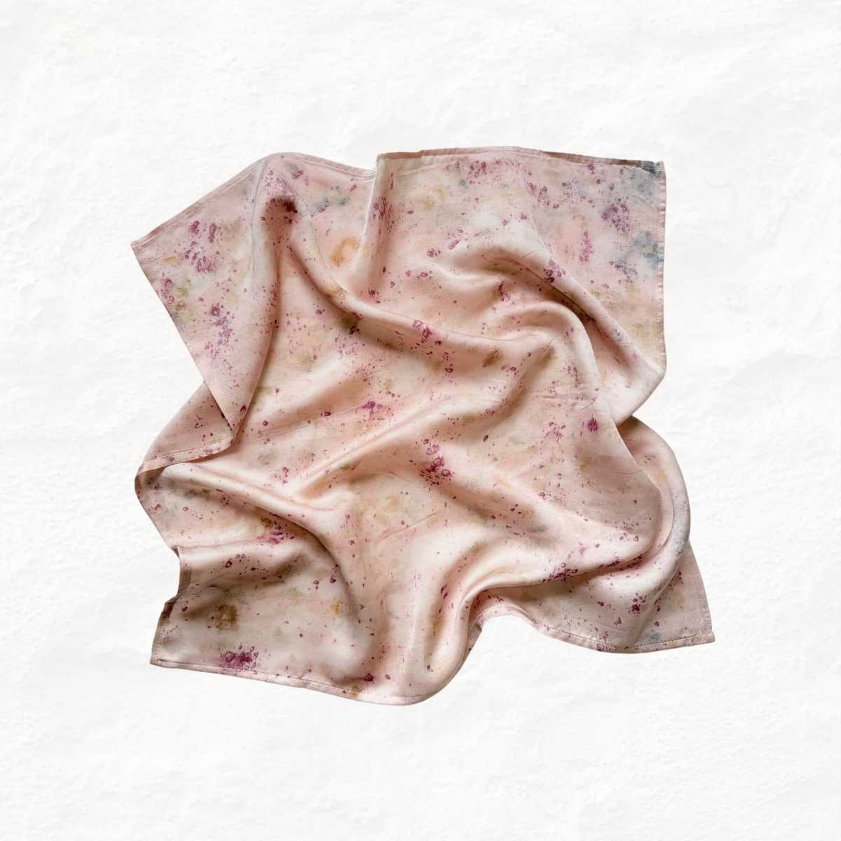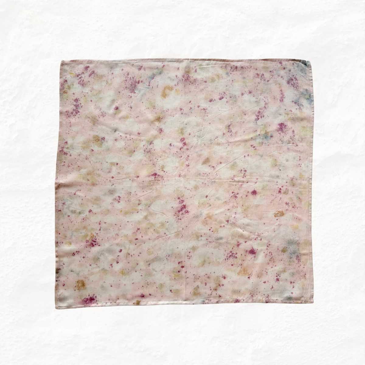 Crafted using eco-printing with real foliage, this bandana captures the beauty of natural dyes on soft blush fabric. Each piece is unique and gently handmade. Eco Printing involves transferring plants, flowers, and stones’ natural colours to fabrics and fixing colours with mordants for them to stay for long. So, these cannot be dry cleaned or bleached.