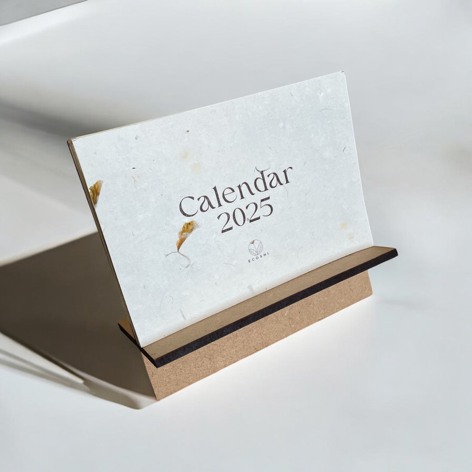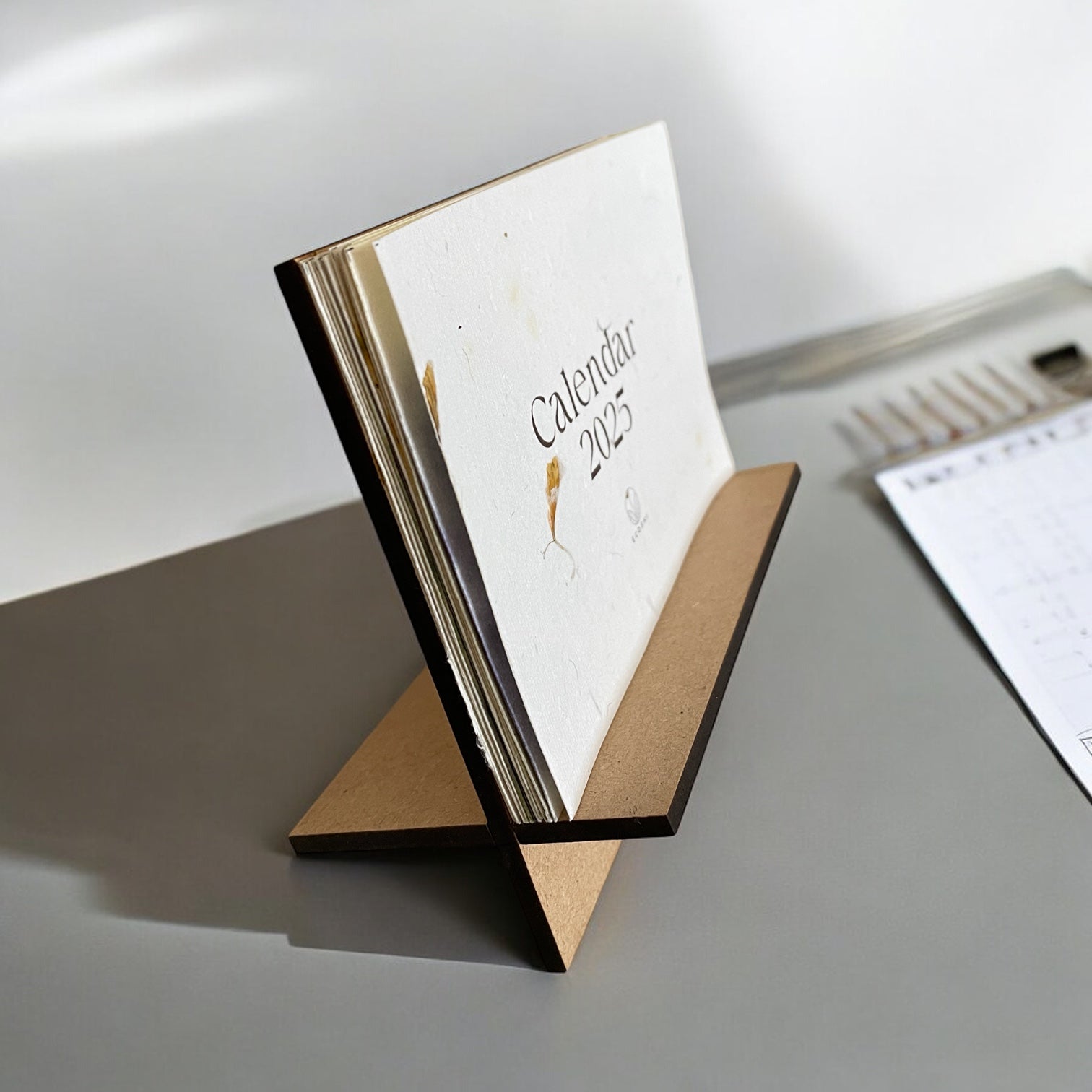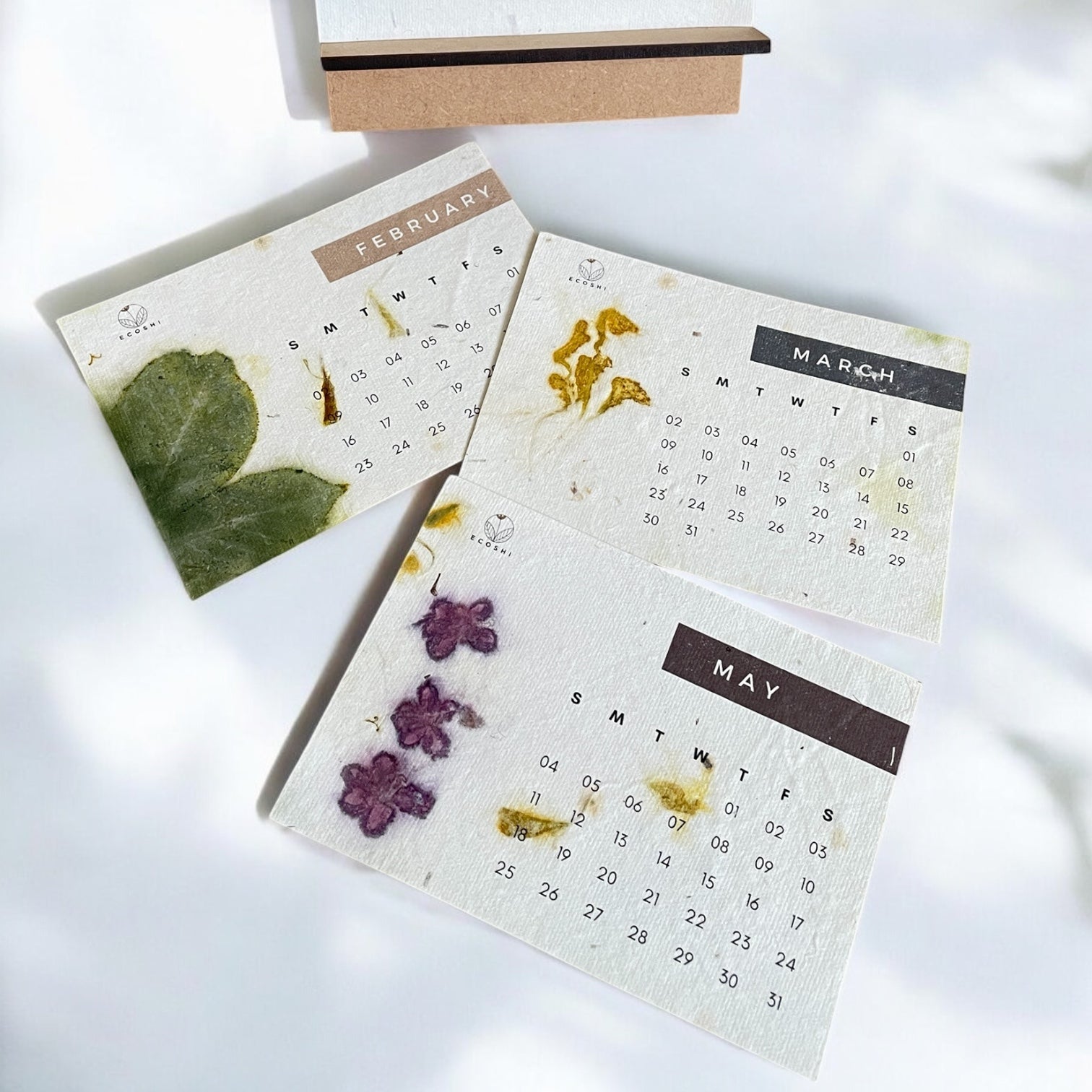 4. Eco-Printed Calendar with MDF Stand: A compact 3.5" x 5" desk calendar showcasing 13 unique eco-printed sheets, paired with a detachable MDF stand for a functional and elegant desk accessory.