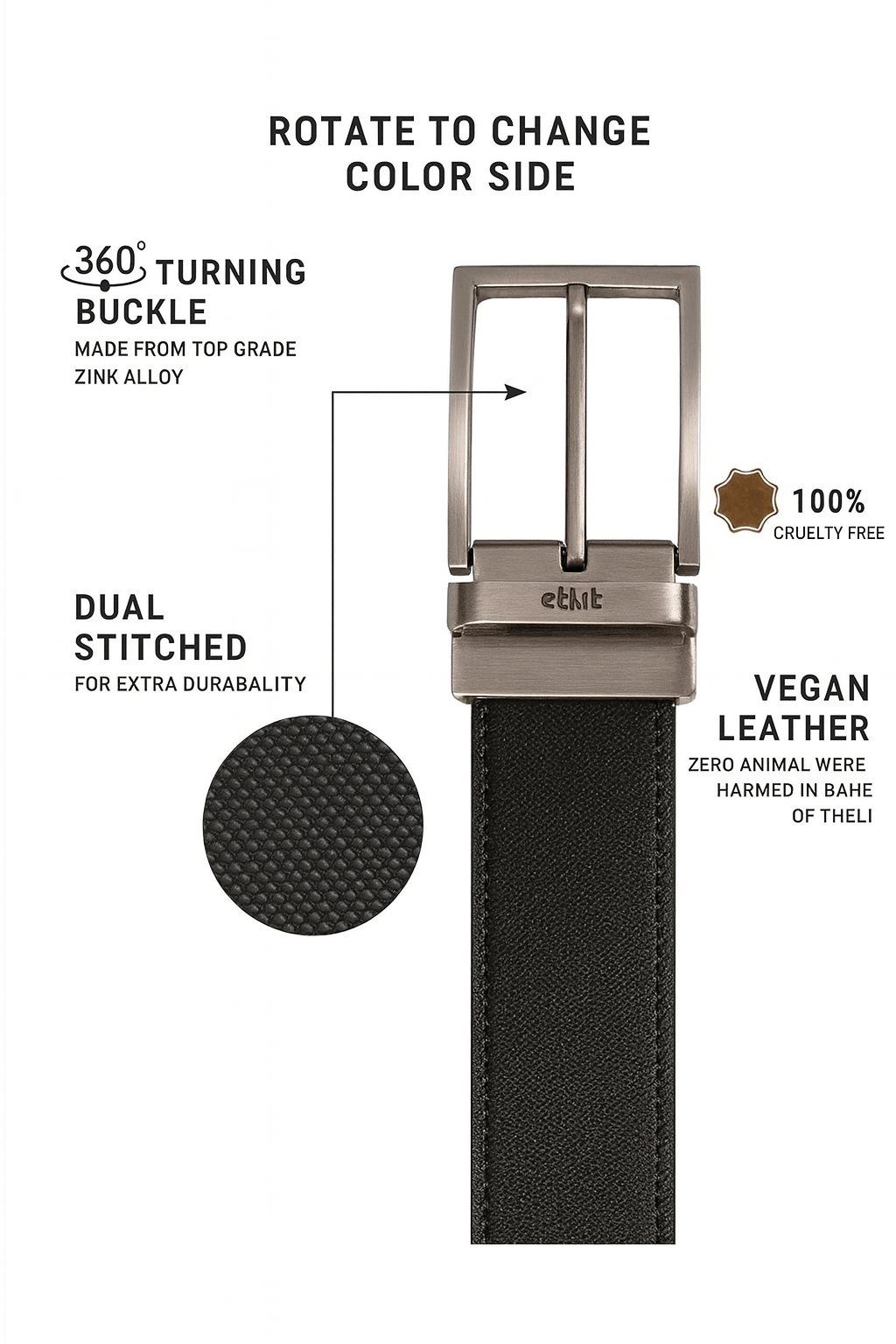 The Elite Black & Tan Belt is designed for men who value refined style and everyday versatility. Crafted from premium vegan leather, it features a sleek reversible strap that switches effortlessly between Black and Tan, making it the perfect belt for both formal occasions and business wear.