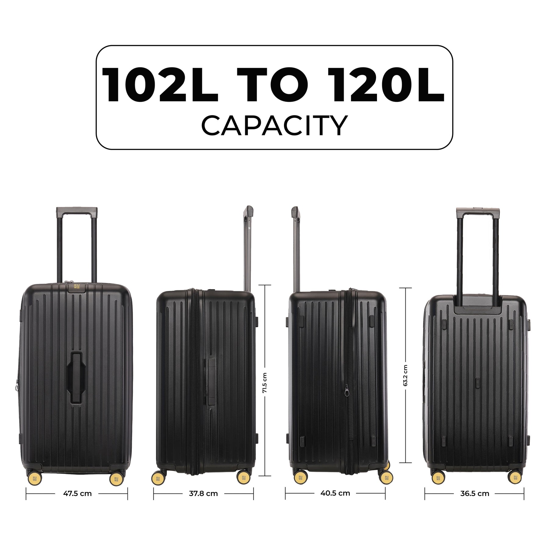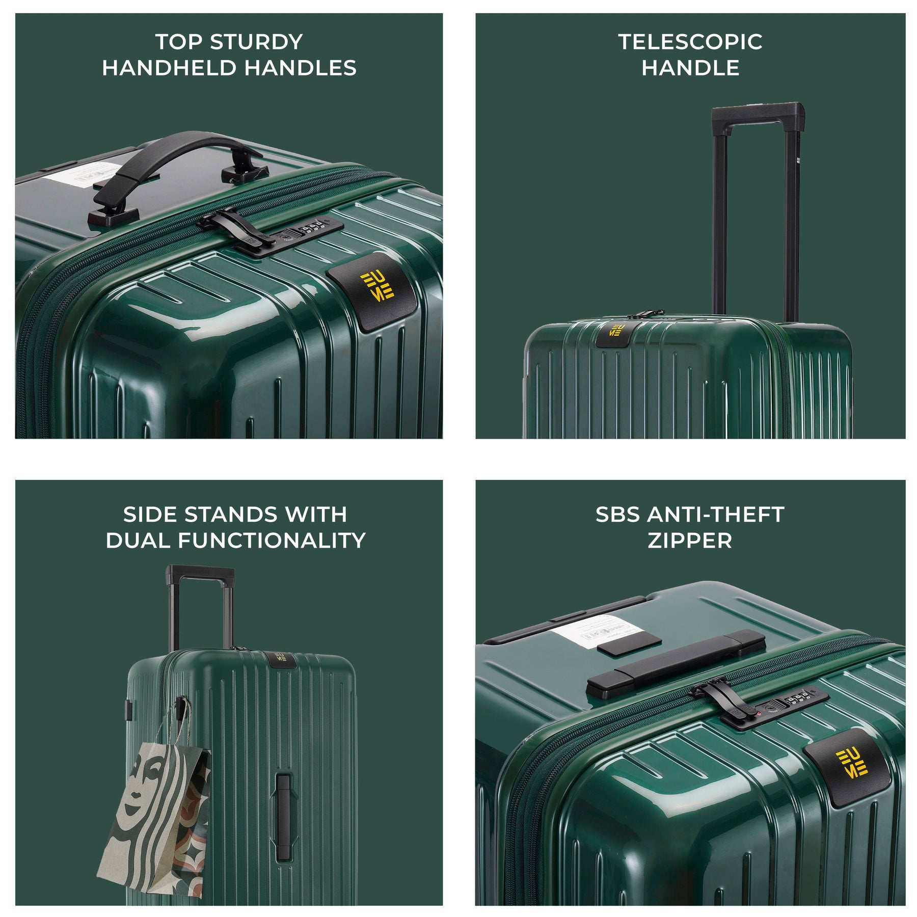 • These polycarbonate trolley bags feature three sturdy handheld handles capable of lifting up to 22kgs, and a premium-quality zippers for reliable closure, ensuring convenience and durability. Further, our luggage trolley can be extended by up to 3 inches, providing more room for extra items when needed.