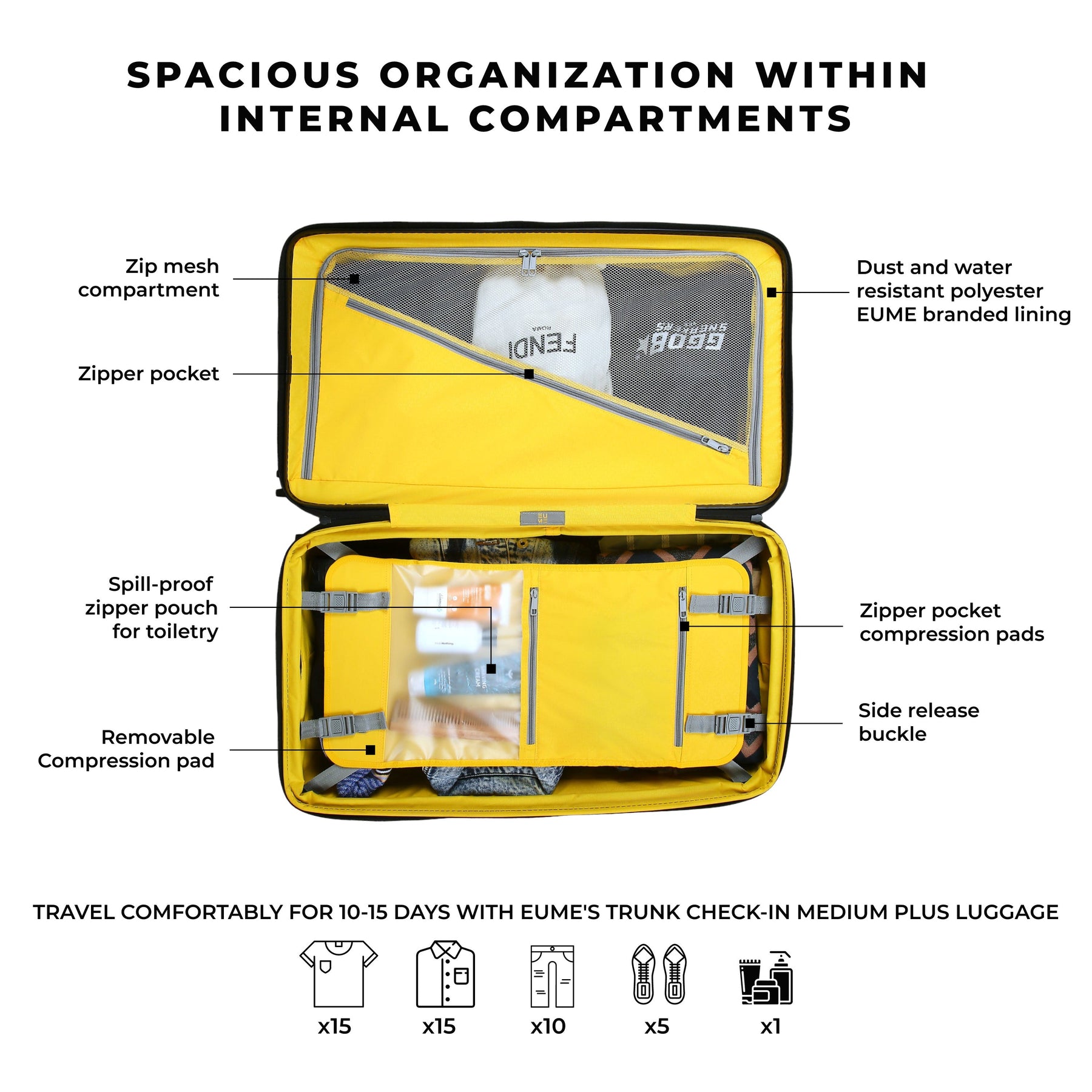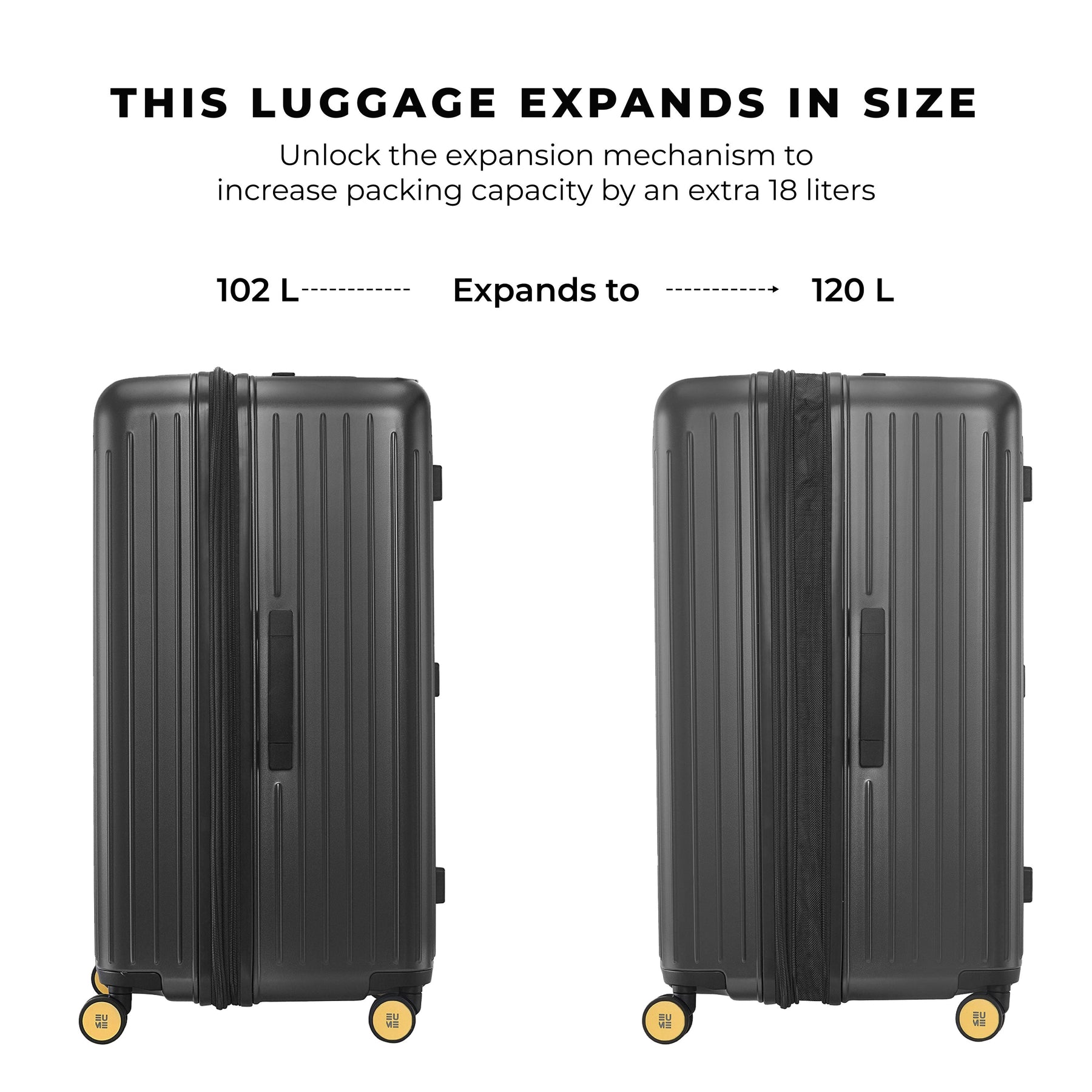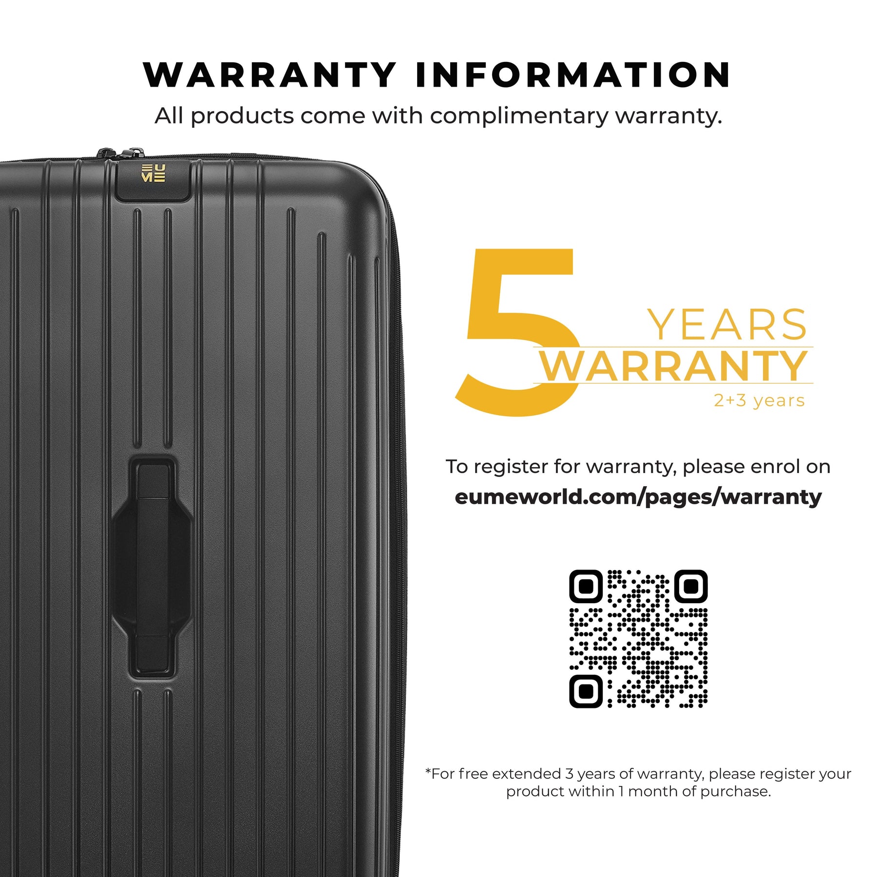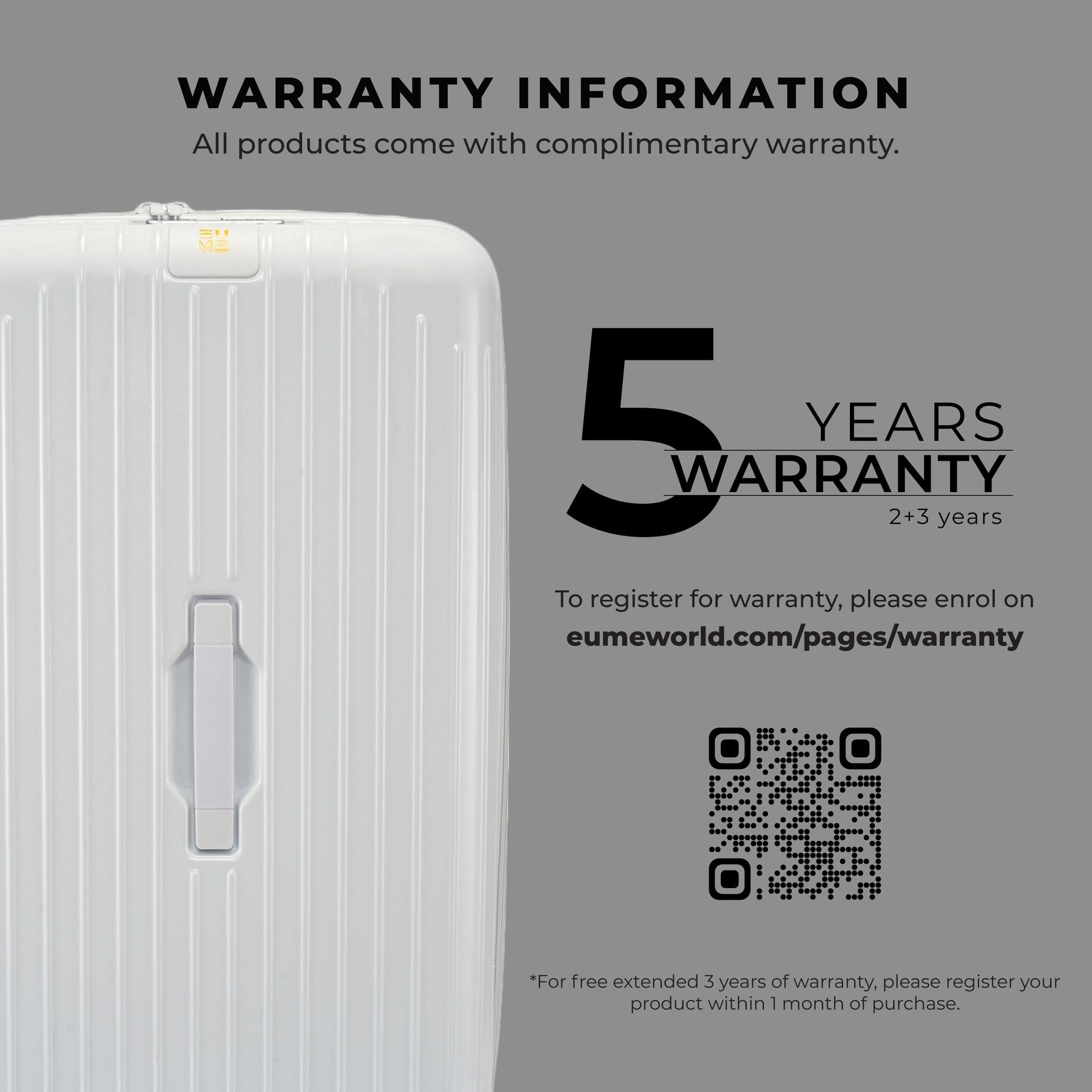 • The EUMETrunk Check-in Plus Luggage is backed by a 5-Year Warranty by EUME against all manufacturing defects. This warranty is broken into a complimentary 2-year warranty by EUME. To enjoy an extended 3 years of warranty for free, please register your product within 1 month of purchase.