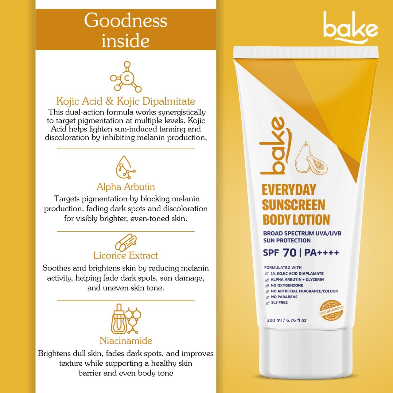 Shield your skin daily with BAKE Everyday Sunscreen Body Lotion SPF 50 PA+++, a powerful blend of sun protection and skin-brightening ingredients. Enriched with 2% Kojic Acid and Alpha Arbutin, it helps fade pigmentation, reduce tanning, and promote an even skin tone. The high SPF 50 PA+++ formula offers broad-spectrum protection against harmful UVA/UVB rays, preventing sunburn and premature aging. Lightweight and non-greasy, it absorbs quickly into the skin, leaving it hydrated and smooth. Ideal for everyday use, this lotion protects your skin while addressing discoloration and dullness. Suitable for all skin types, it is the perfect addition to your daily skincare routine for glowing, protected skin.