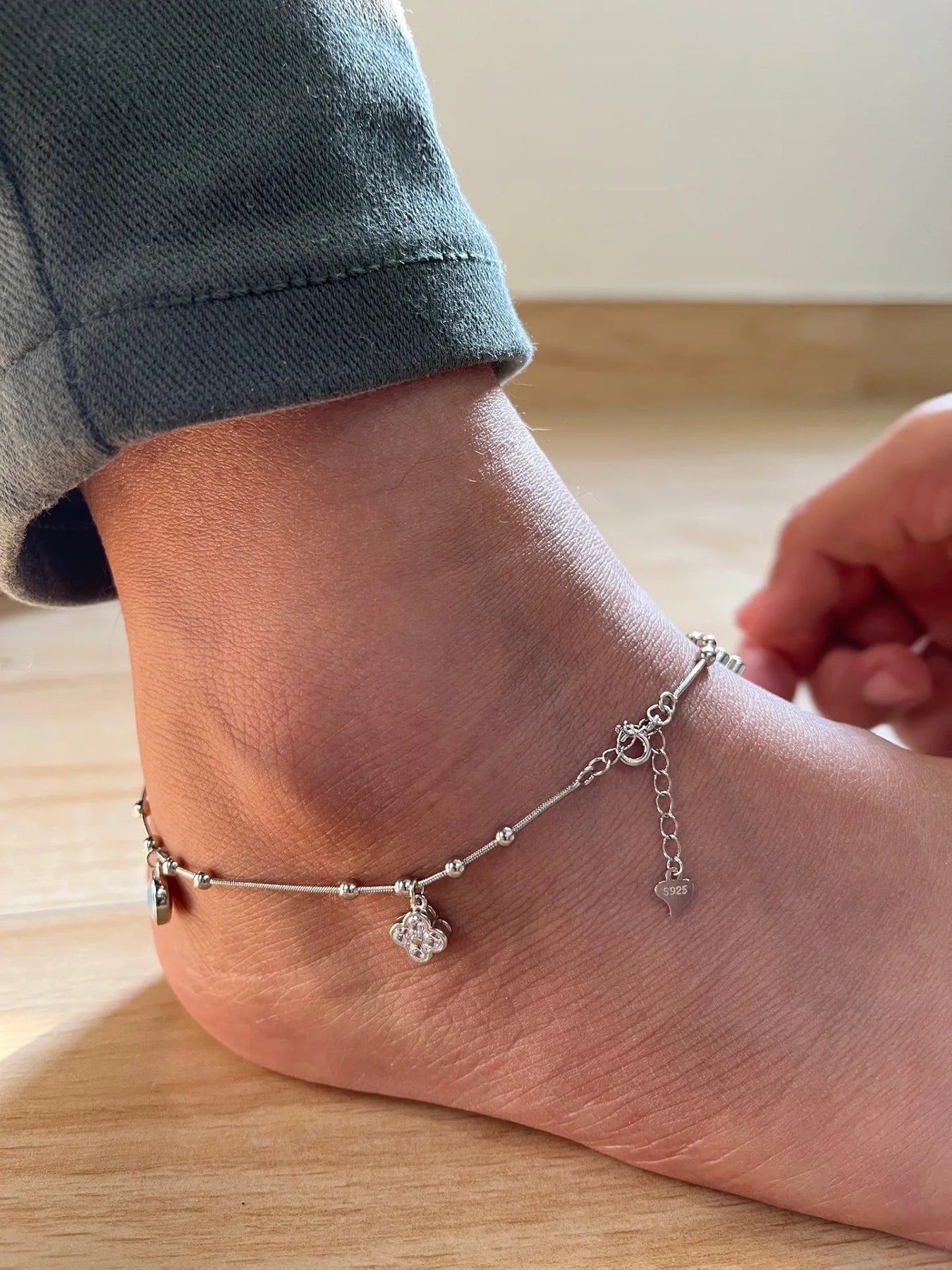 Evil Eye Sterling Silver Anklet with Foral Charms and Beads (White Stone) - Suspire