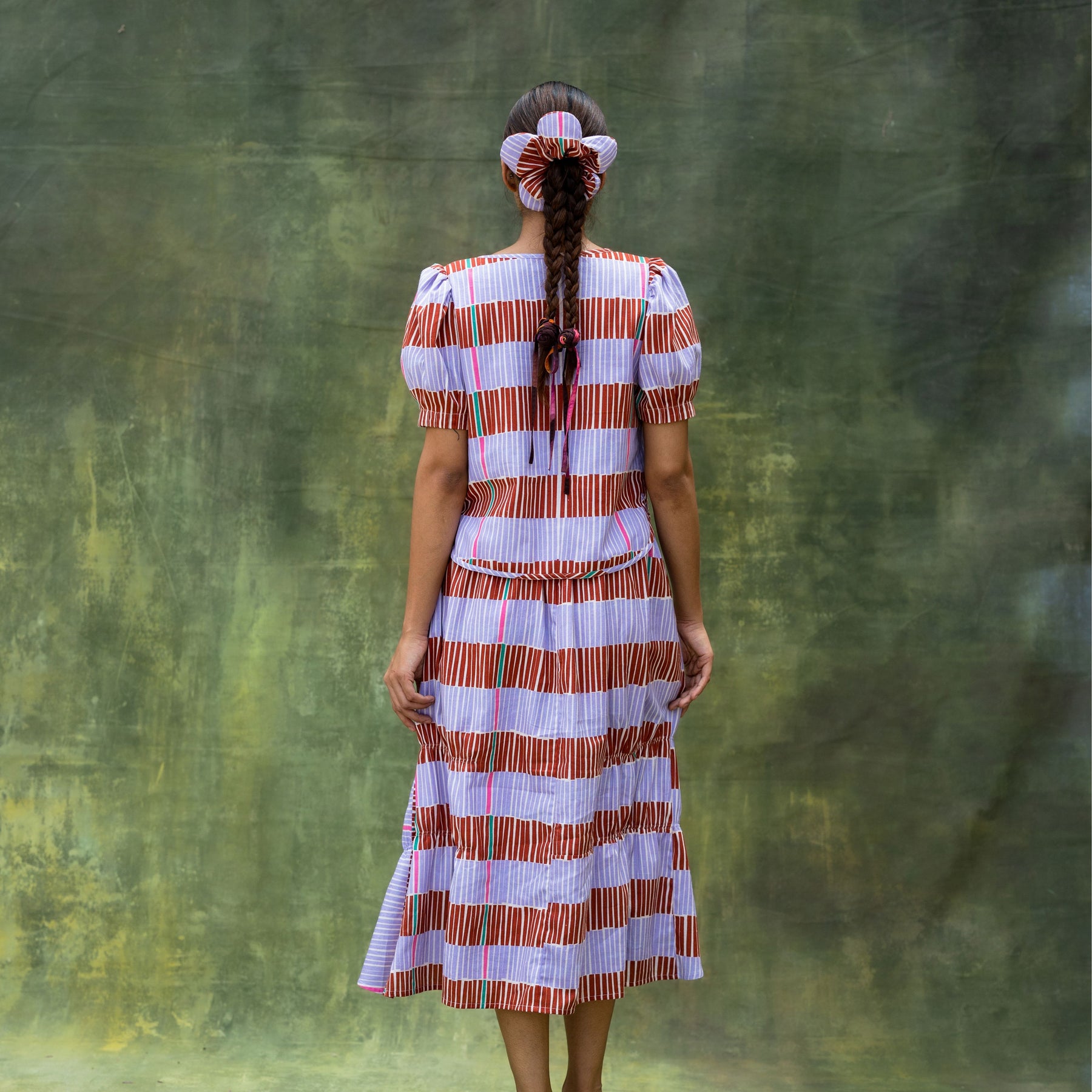 Short stripe top with patch pockets and frill detail. Front tie closure. With deconstructed skirt with gathers and back elastic with inseam side pockets.