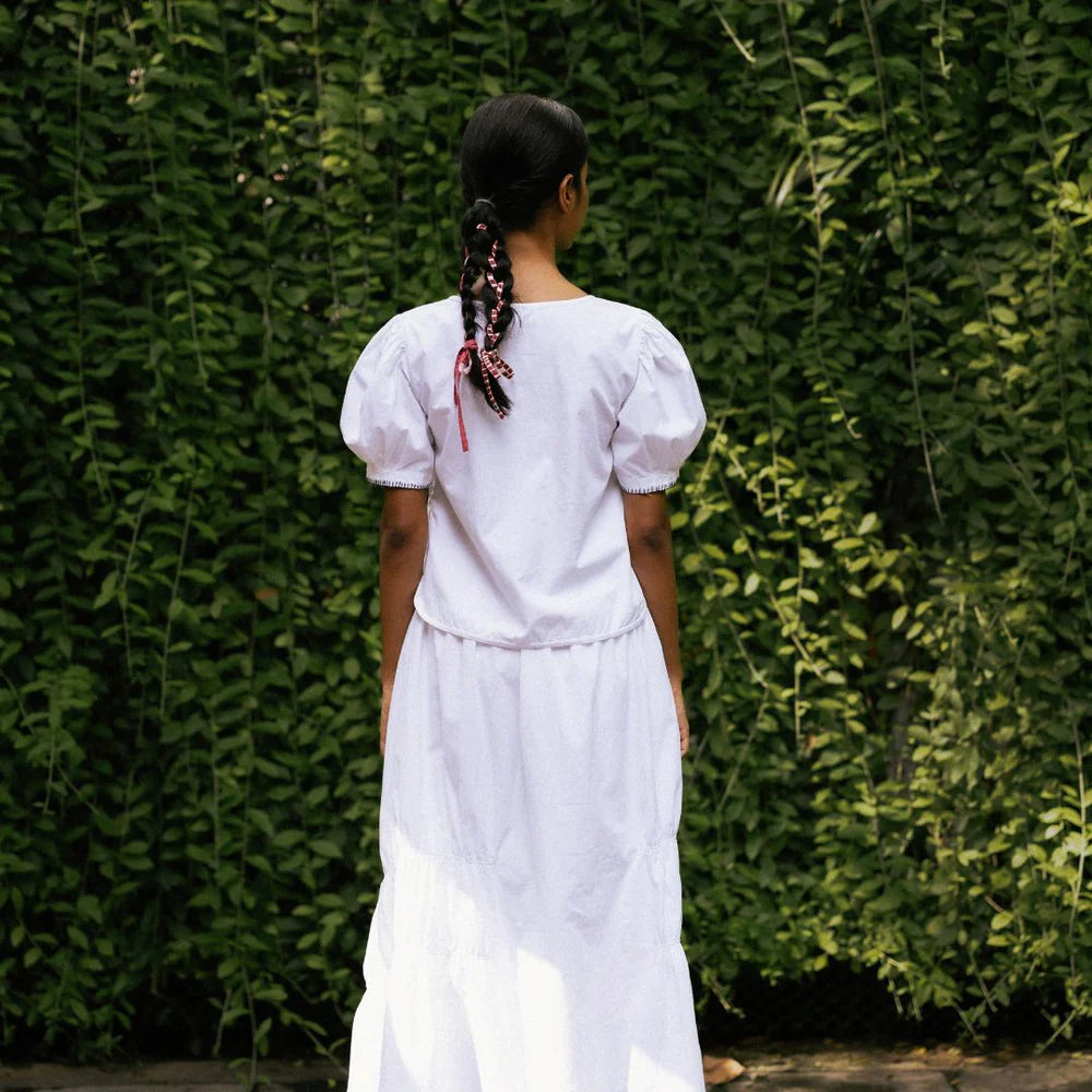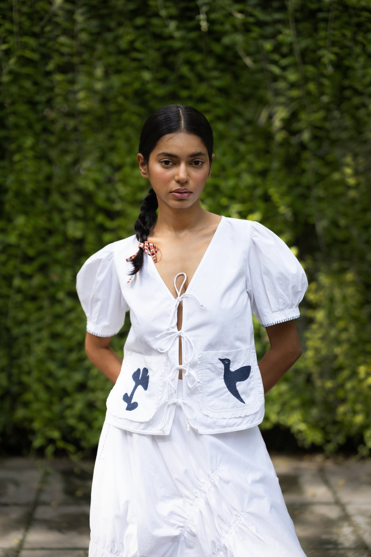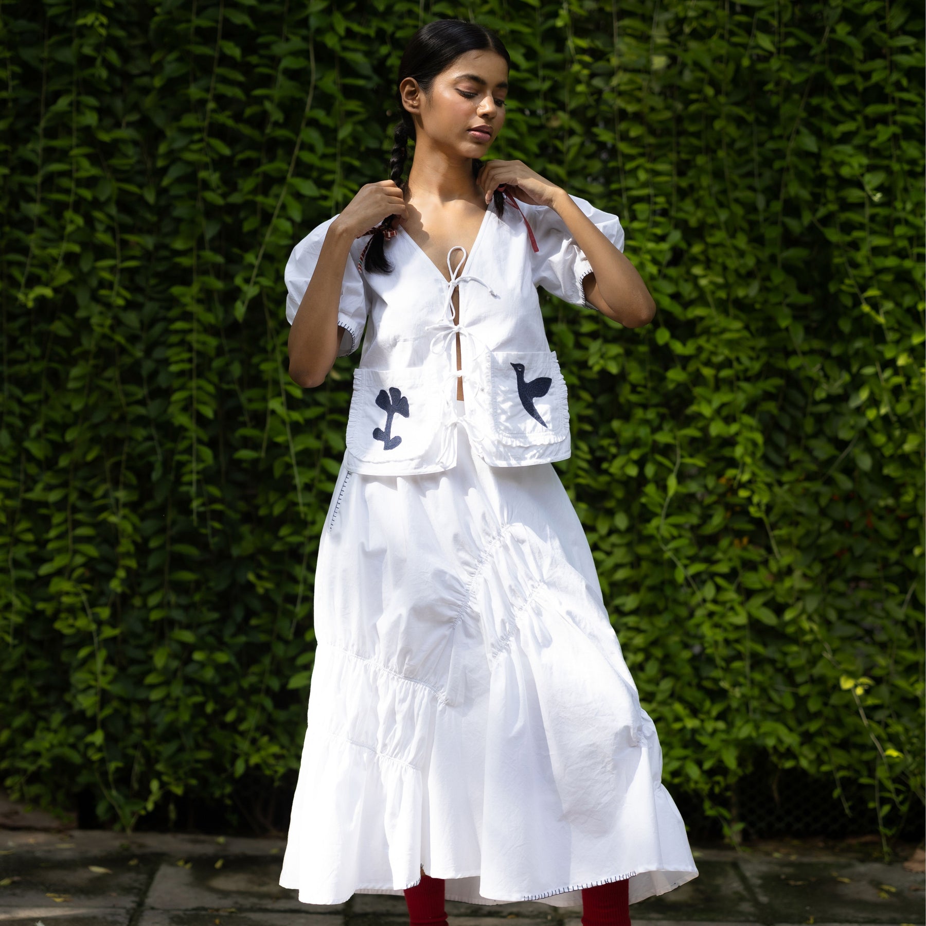 Short white top with patch pockets and frill detail. Front tie closure with patch embroidery. With deconstructed skirt with gathers and back elastic with inseam side pockets.