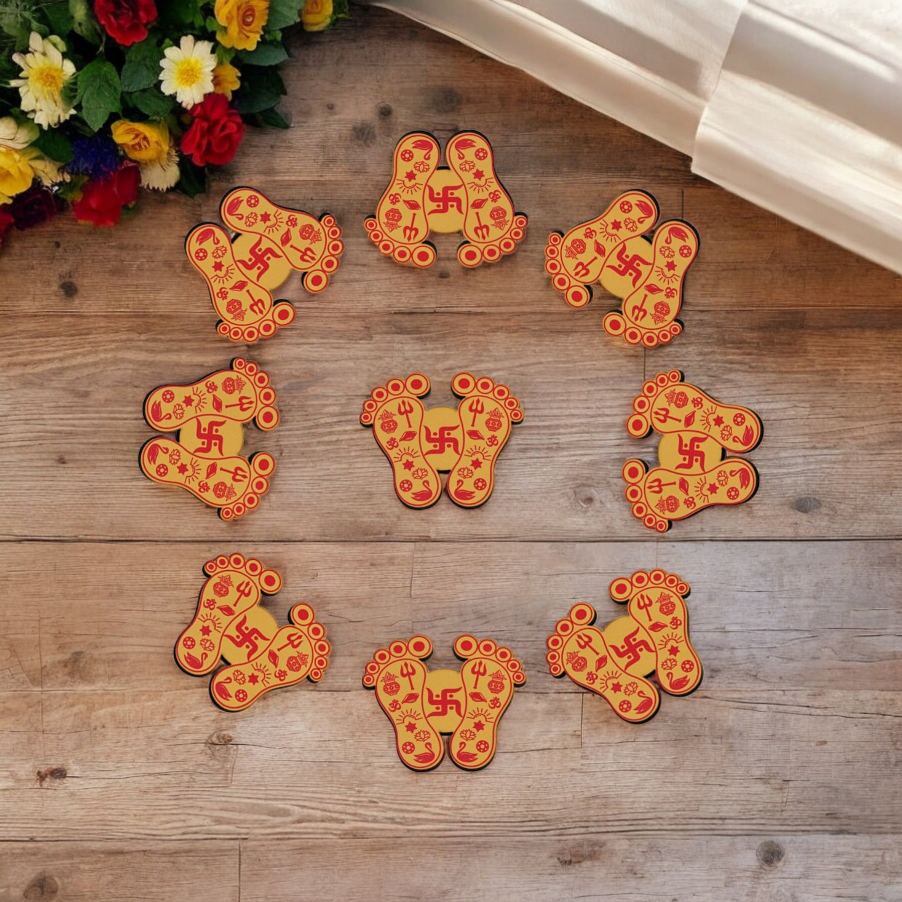 • Charan Paduka: Symbolic wooden foot imprints representing divine blessings, ideal for placing at the entrance or in your puja room.