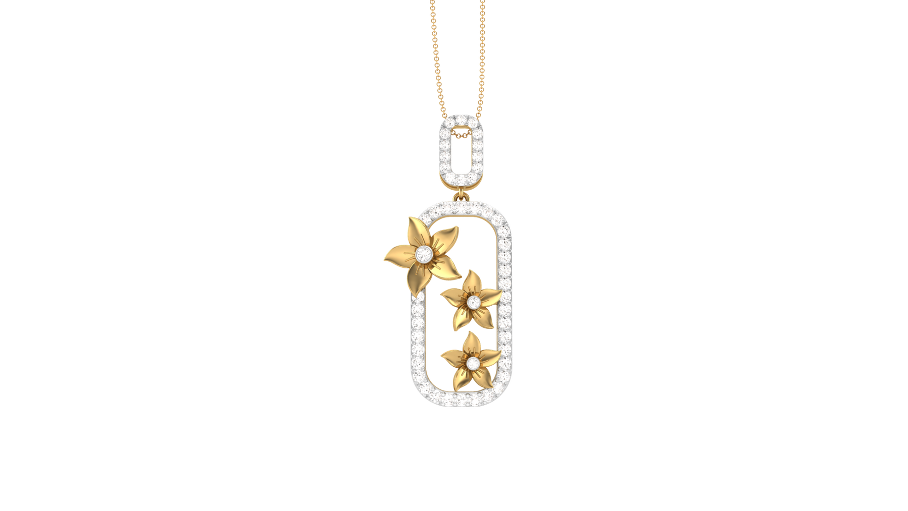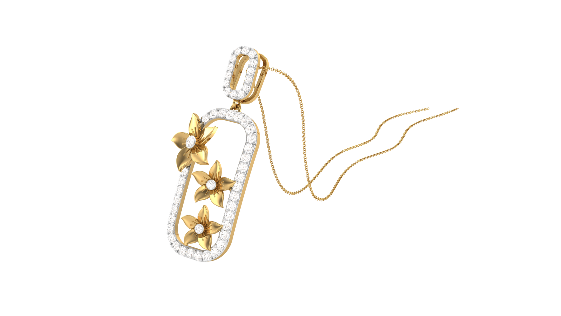 Celebrate elegance in bloom with this delicate 18K gold pendant featuring a cascade of three sculpted golden flowers, each accented with a shimmering round diamond. The elongated rectangular frame is encrusted with fine pavé-set diamonds, offering a graceful contrast to the polished gold florals. The pendant's vertical flow makes it ideal for both modern and traditional styles.