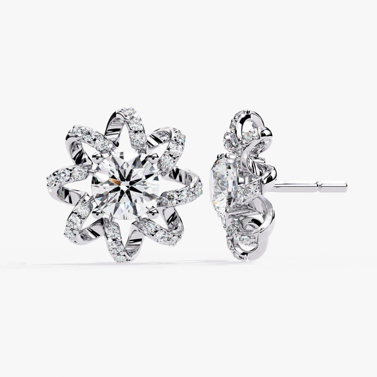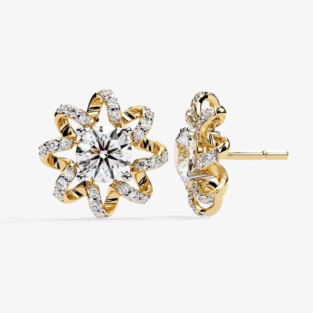 A striking blend of artistry and brilliance, these Floral Swirl Diamond Stud Earrings are designed to mesmerize. Featuring a dazzling round-cut center diamond surrounded by alternating loops of pavé-set diamonds, they exude elegance with every detail. Whether worn to a festive celebration or as an everyday luxury, they’re a celebration of symmetry, sparkle, and sophistication.