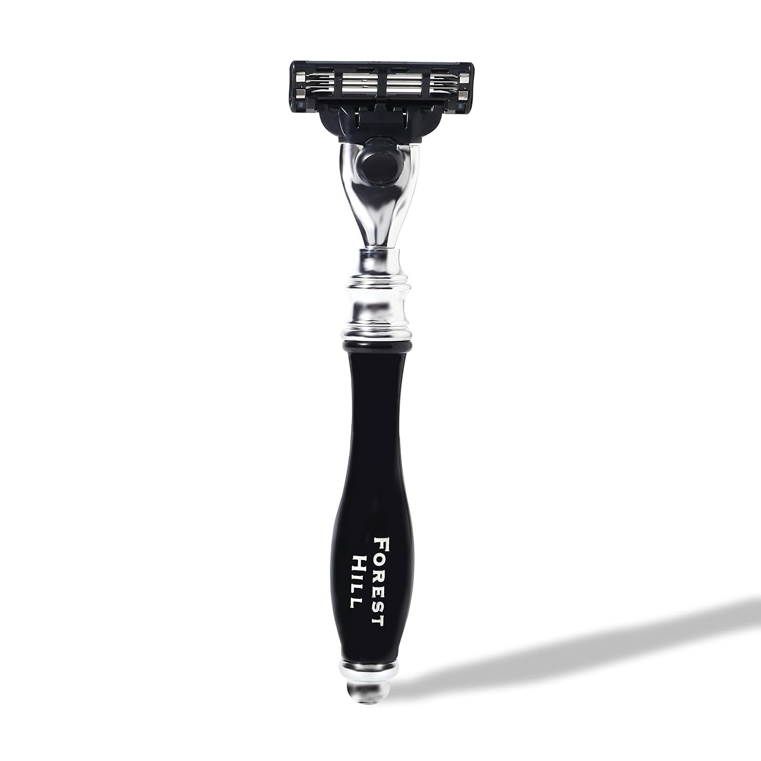 Forest Hill Pack of 3 Men Shaving Kit, Black Ashford Shaving Brush With Holder, Stainless Steel Mach 3 Replaceable 3 Blade Shaving Razor With Black Silicone Protective Sleeve & Steel Shaving Razor & Brush Stand