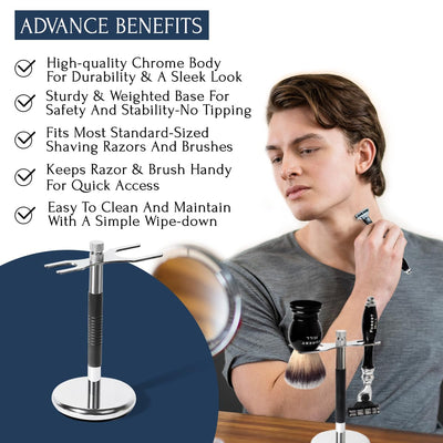 SHAVING BRUSH & RAZOR STAND: Made of high-quality chrome for durability and a sleek look. Sturdy and weighted base ensures safety and stability to prevent tipping over. Fits most standard-sized shaving razors and brushes. Keeps razor and brush within easy reach for easy access and organisation.