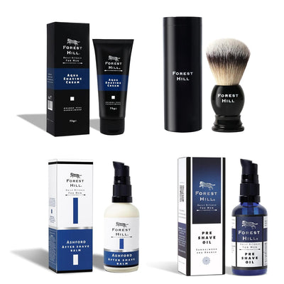 Forest Hill Pack of 4 Men Shaving Kit, Black Ashford Shaving Brush With Holder, Aqua Shaving Cream 75gm, Pre Shave Oil 50ml & Ashford After Shave Balm 100ml