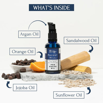 PRE SHAVE OIL: Made with a natural premium cold pressed oil blend, it contains Argan oil, Jojoba oil, Vitamin E, Olive oil, and other nourishing ingredients that work together to prepare your skin for a smooth and comfortable shave. It is designed to hydrate and protect your skin, allowing the razor to glide smoothly over your face without causing nicks or cuts. It helps to soften facial hair, making it easier to shave, and reduces irritation and razor burns. Formulated with only the finest natural ingredients, our Pre Shave Oil is perfect for those with sensitive skin or anyone who wants to enjoy a luxurious and comfortable shaving experience Our Pre Shave Oil helps to soften facial hair, making it easier to shave and reducing the risk of nicks and cuts. Formulated with natural ingredients like Argan oil, Jojoba oil, Vitamin E, and Olive oil, our Pre Shave Oil helps to reduce irritation and razor burns, leaving your skin feeling smooth and comfortable. Our Pre Shave Oil creates a protective barrier between your skin and the razor, helping to prevent nicks and cuts and ensuring a nick-free shaving experience. With its blend of natural oils, our Pre Shave Oil provides essential hydration and nourishment to your skin, leaving it feeling soft and moisturized. Our Pre Shave Oil is perfect for those with sensitive skin, as it is formulated with only the finest natural ingredients to ensure a luxurious and comfortable shaving experience.