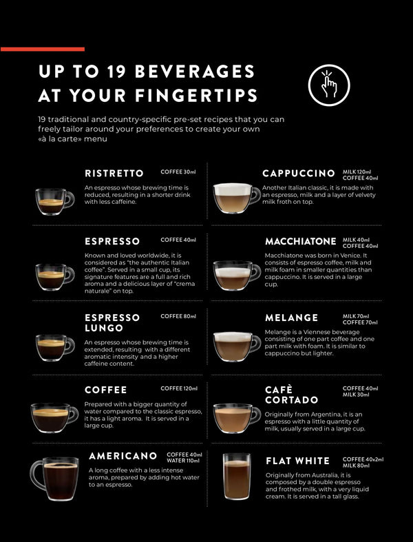 Coffee Types: Ristretto, Espresso, Espresso Lungo, Coffee, Americano, Cappuccino, Latte, Macchiato, Macchiatone, Melange, Cafe' Au Lait, Flat White, Cortado, Cappuccino XL, Latte Macchiato XL, Frothed Milk, Hot Water, Hot Milk, Green Tea, Black Tea
