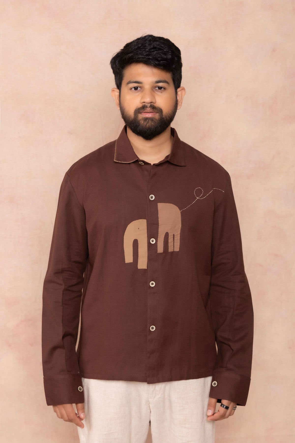 At its heart lies an elephant done through appliqué technique. The true charm unfolds in tail, reimagined in a whimsical spiral, extending beyond the motif dancing across the fabric. Thoughtful detailing graces the collar on one side, adding an understated yet refined touch.