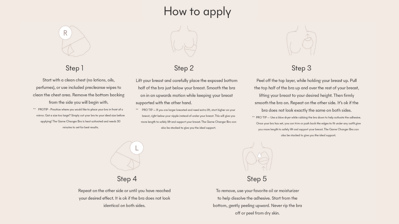 " This is what freedom feels like! I’ve never been so impressed with an adhesive bra. The different skin tones are gorgeous." - Cristina Varga A ready-to-wear, backless strapless adhesive bra that provides lift, shape & support for tatas of ALL sizes (even DDD/G & F bra zones!). Made of breathable sustainable hemp fabric that is sweatproof and waterproof. 4 one-time use pairs per pack. Made in Korea for premium quality. ALWAYS REMOVE WITH OIL With great cleavage comes great responsibility. Please read the instructions carefully and safety guidelines . Never try to remove the tape with dry skin or water. The Game Changer and Shape Tape are waterproof and MUST be removed with oil or medical tape remover (baby oil & coconut oil work well).