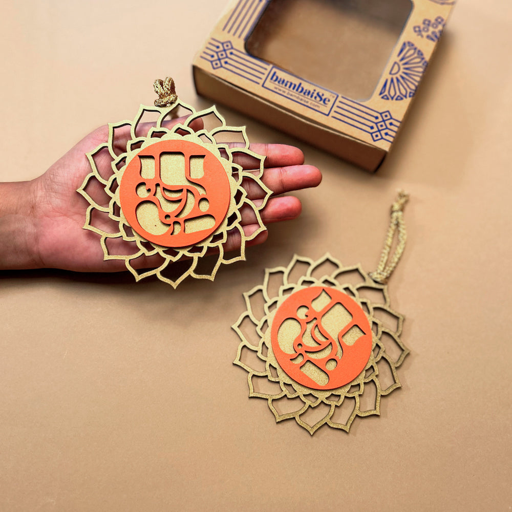 This piece fits flawlessly on any entrance, effortlessly adding a touch of culture to your space. Whether hanging on the wall or gracing your door, it's an easy and elegant addition to your decor. Embrace tradition with our 'Saffron Gold Ganpati Mandala Wall Decor.