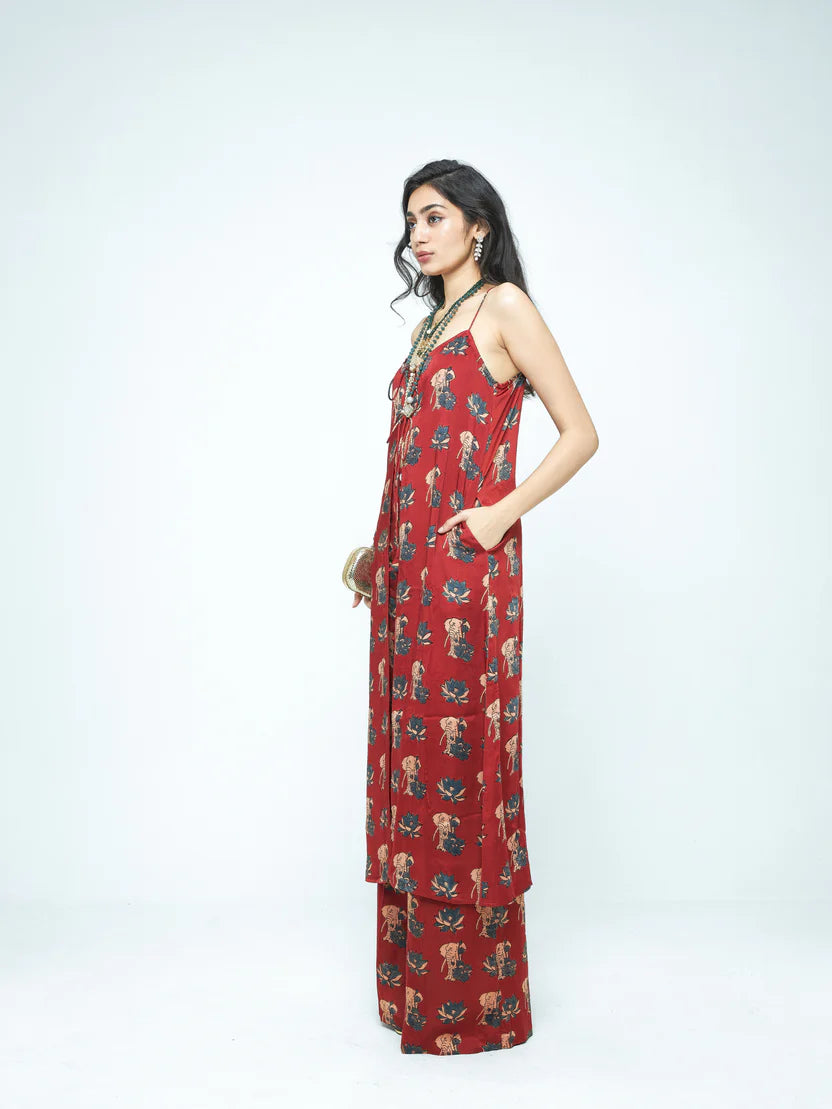• Description: A plunge-neck tunic in modal featuring the Gentle Giant print. Designed with slim straps, front tie-ups, and a fluid fit, it balances ease and elegance — perfect for layering or wearing as a statement piece on its own.