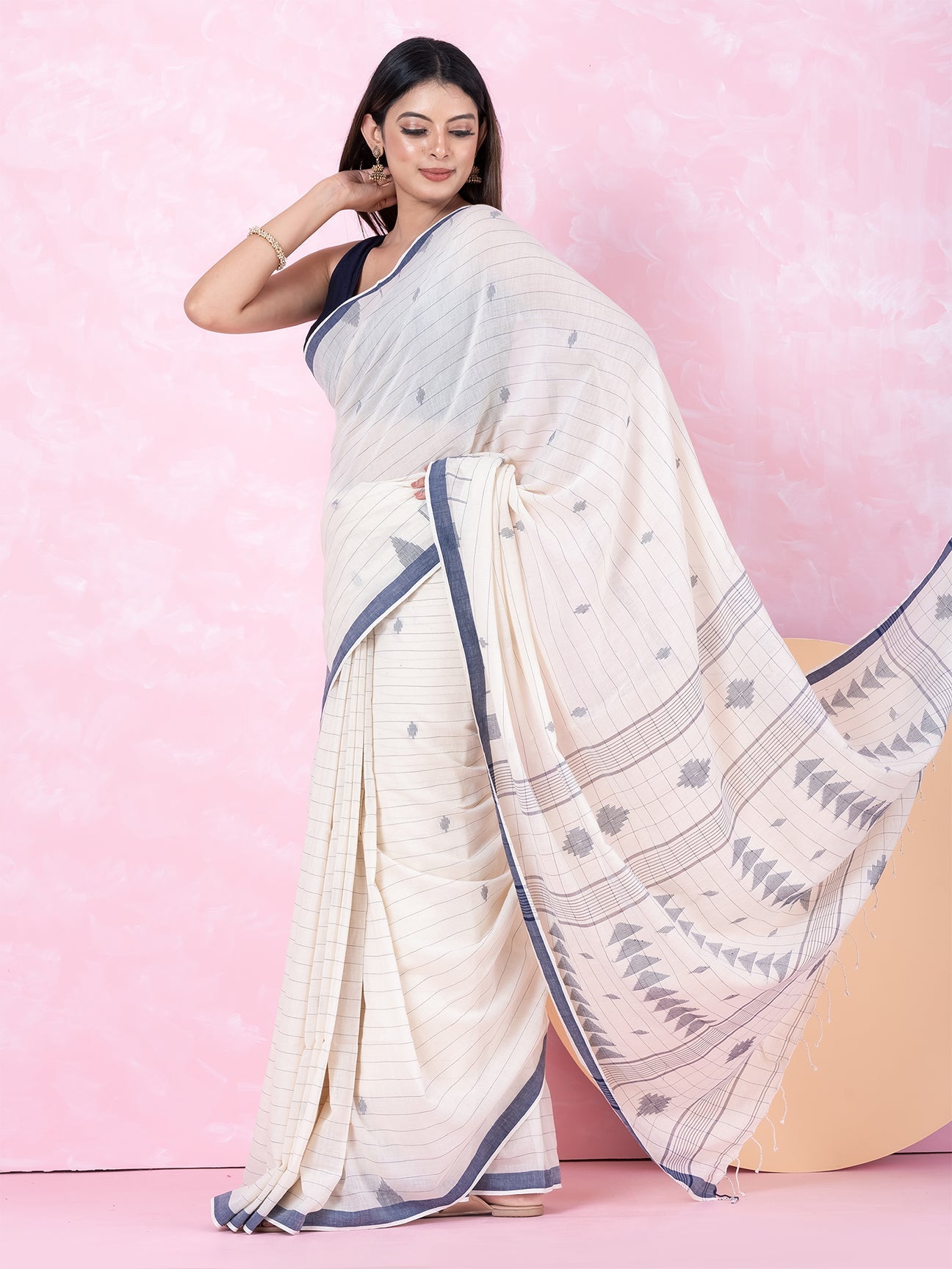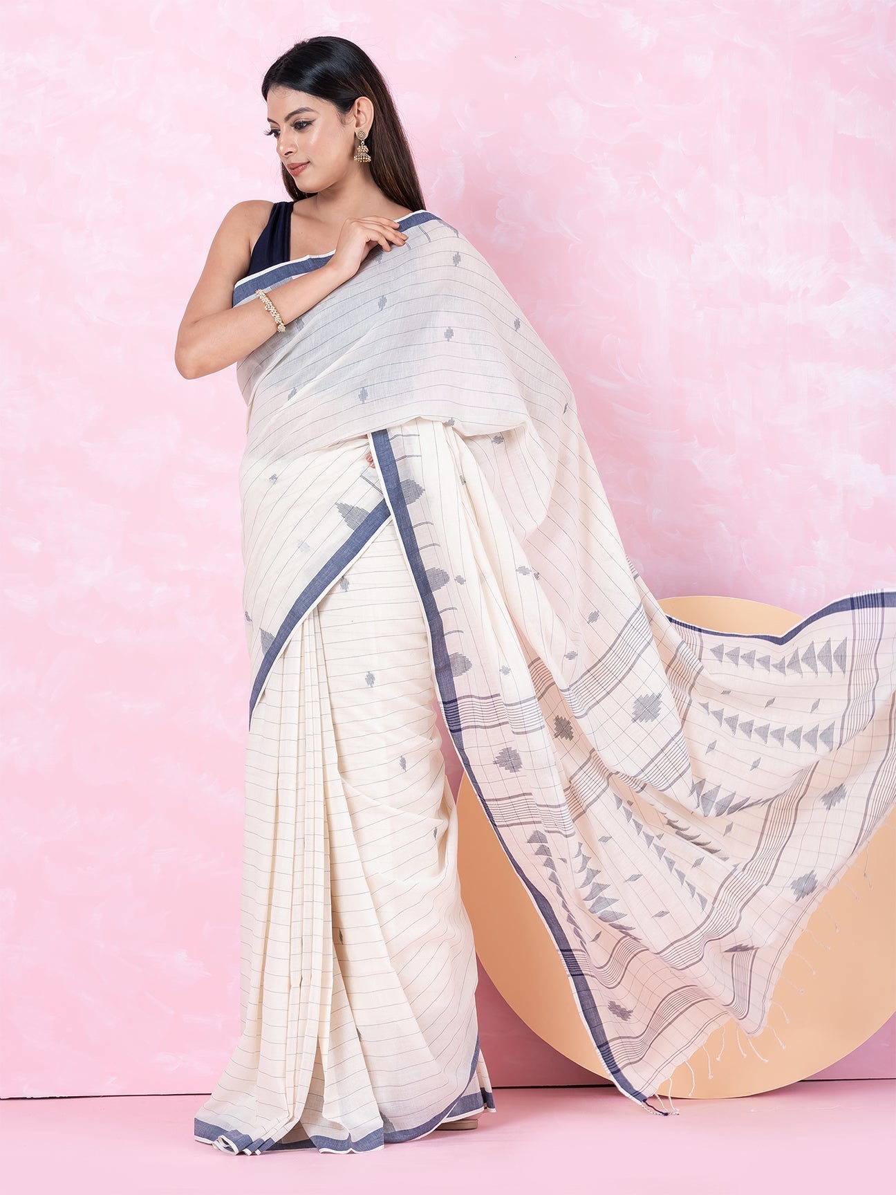 OCAU Geometric Bloom - Organic cotton saree with jamdani motifs II Off - White - Suspire