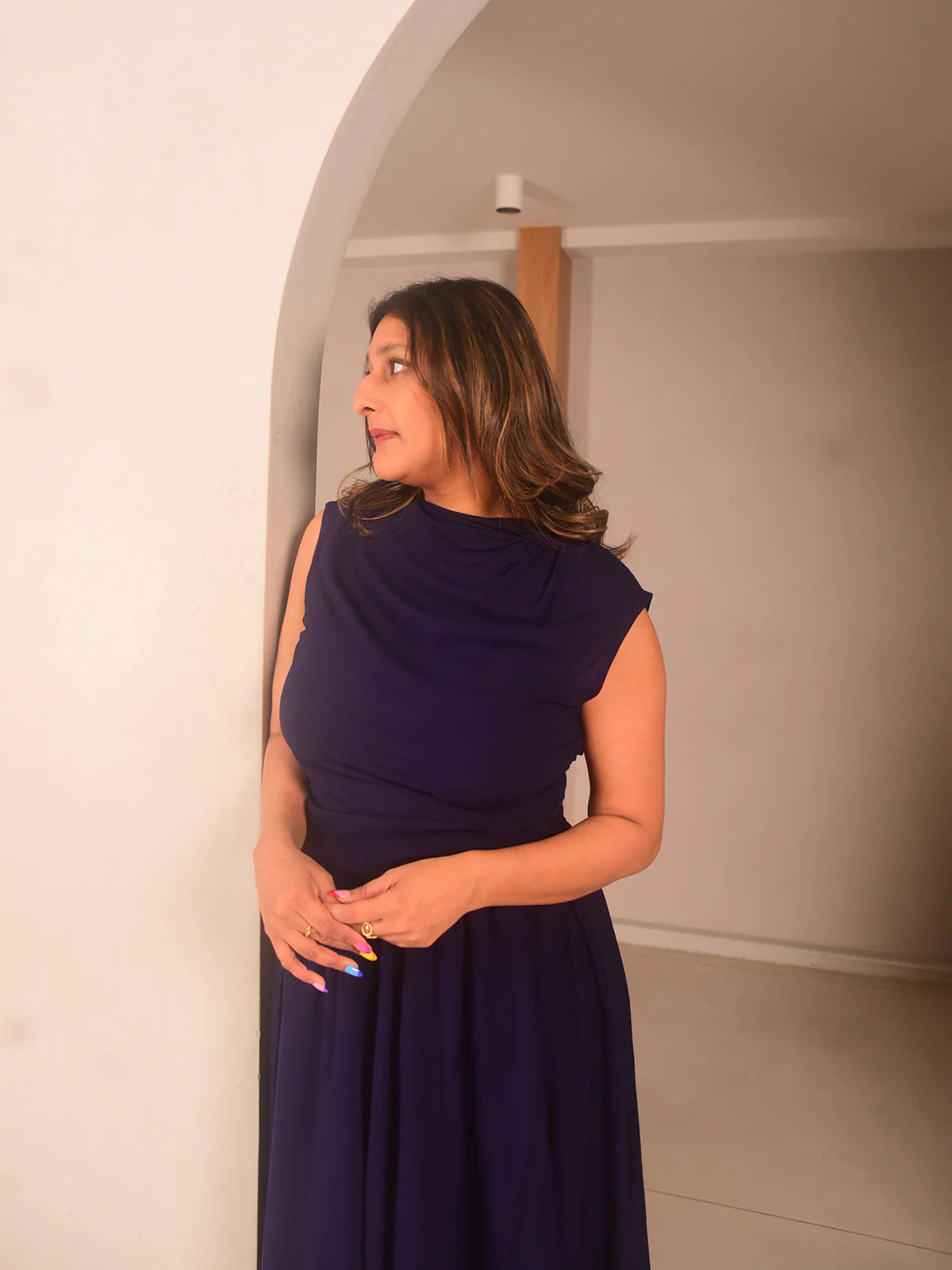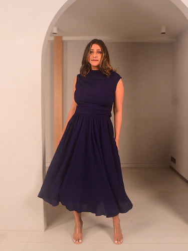 Designed in rich navy blue modal cotton, the Gia Cowl Top features soft shoulder pleats, ruching at the left seam for a cinched waist, and a flattering cowl neckline. Its drop-shoulder, sleeveless design makes it a breathable and refined staple. Best paired with the matching umbrella skirt or tucked into tailored trousers for a fluid silhouette. Great for important workdays, evening events, or stylish desk hours.