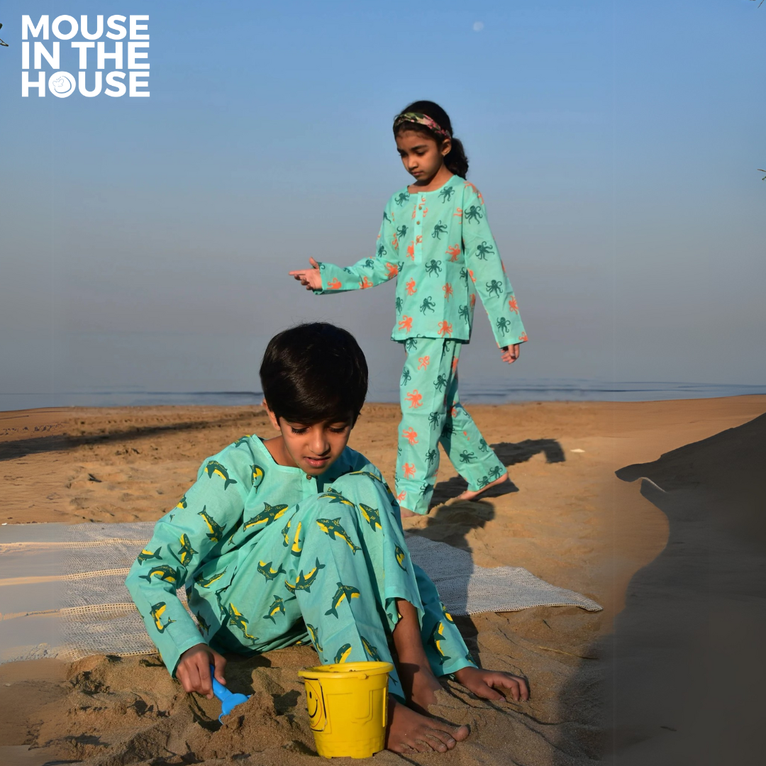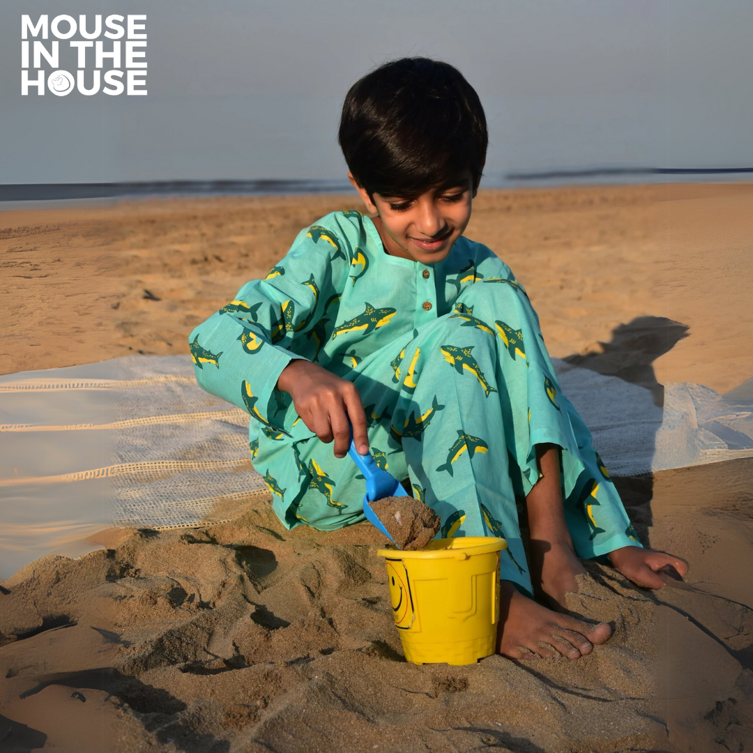 Let your little Mouseling explore the deep sea of dreams with our Shark Print Nightdress! Designed for ultimate comfort, this lightweight, breathable cotton set is perfect for all seasons. Unrestricted by gender, it’s a gentle second skin, keeping your child cozy from playtime to bedtime.