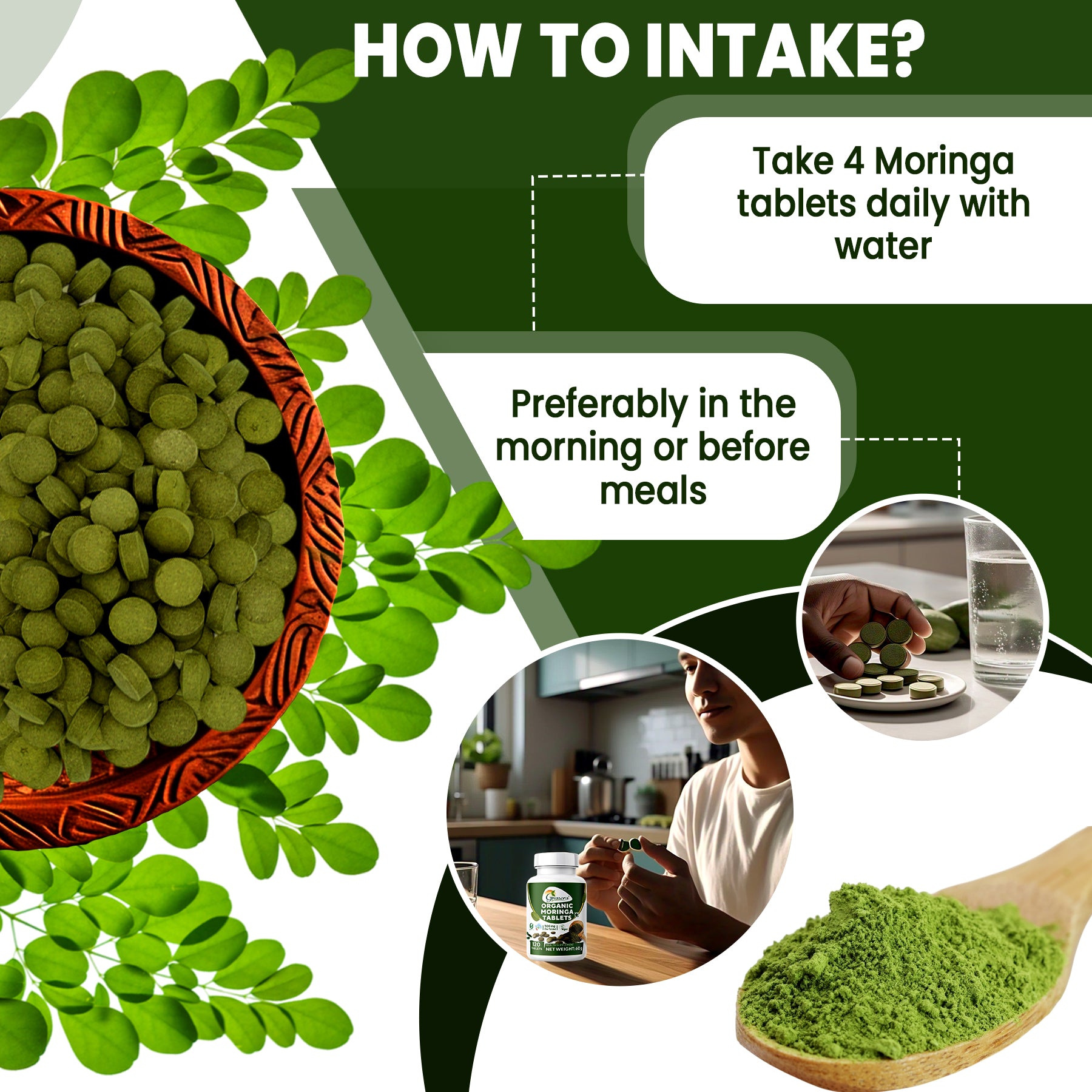 - ORGANIC MORINGA TABLETS: We take utmost care in offering the best quality dried Moringa leaves to our customers. We dry the handpicked Organic Moringa Leaves using cold air. So that the dried product retains all its vital nutrients. Organic Moringa Tablet is made with organic moringa leaf powder and guar gum.
