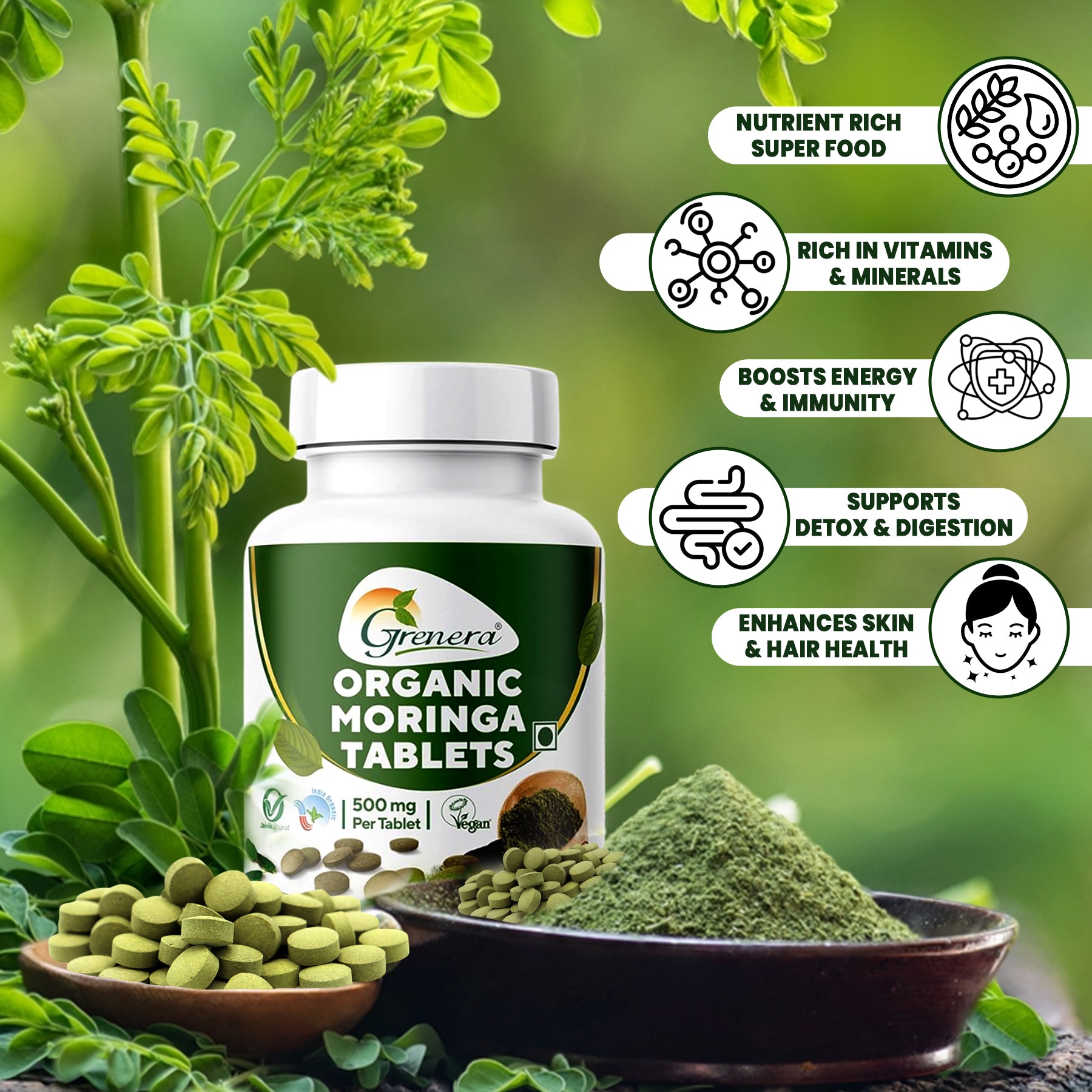 Grenera Organic Moringa Tablets 120 nos, Drumstick Leaf Powder Tablets, Super-Food Shigru, Vegan, Gluten Free, Non GMO