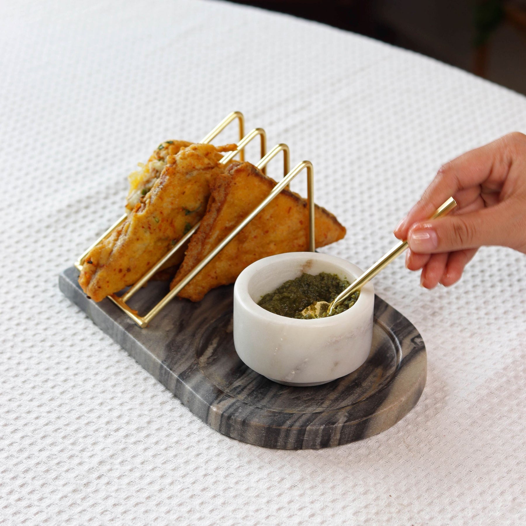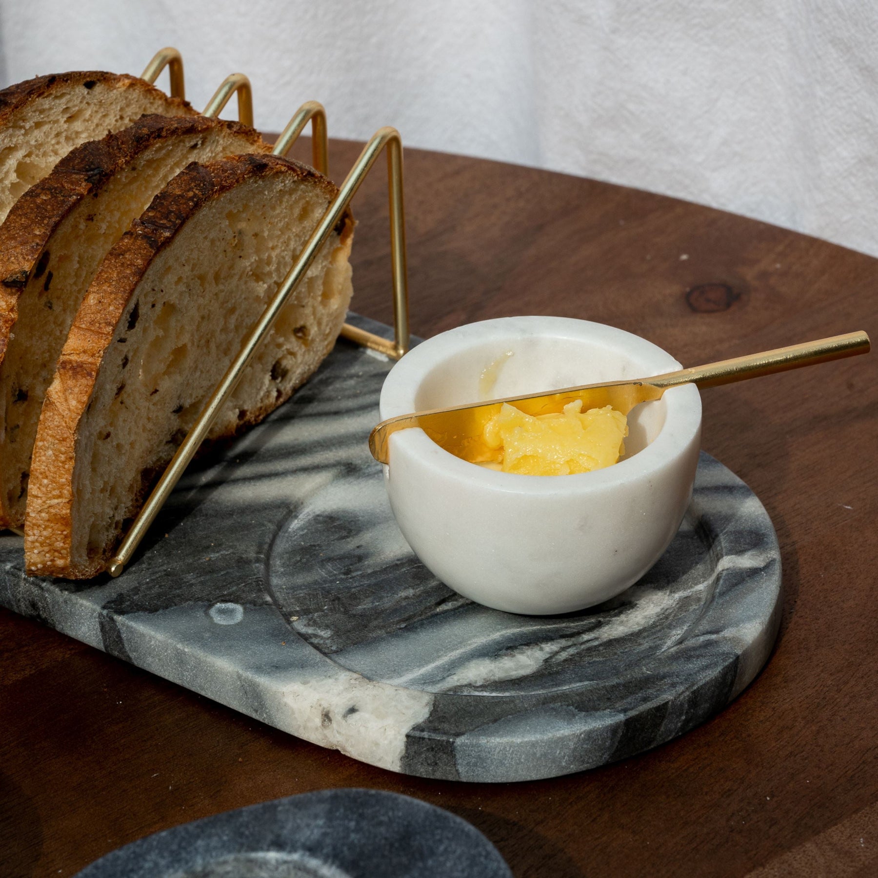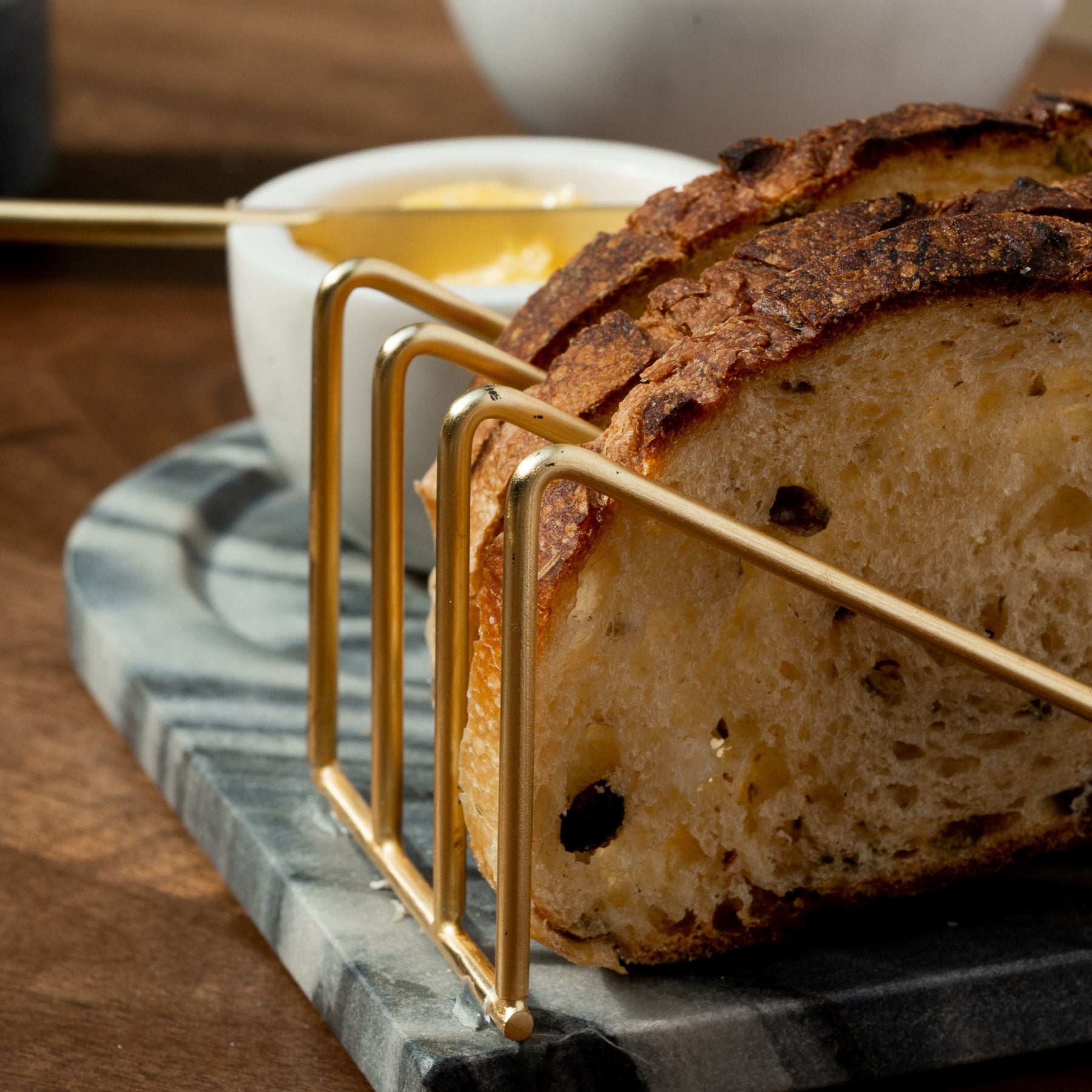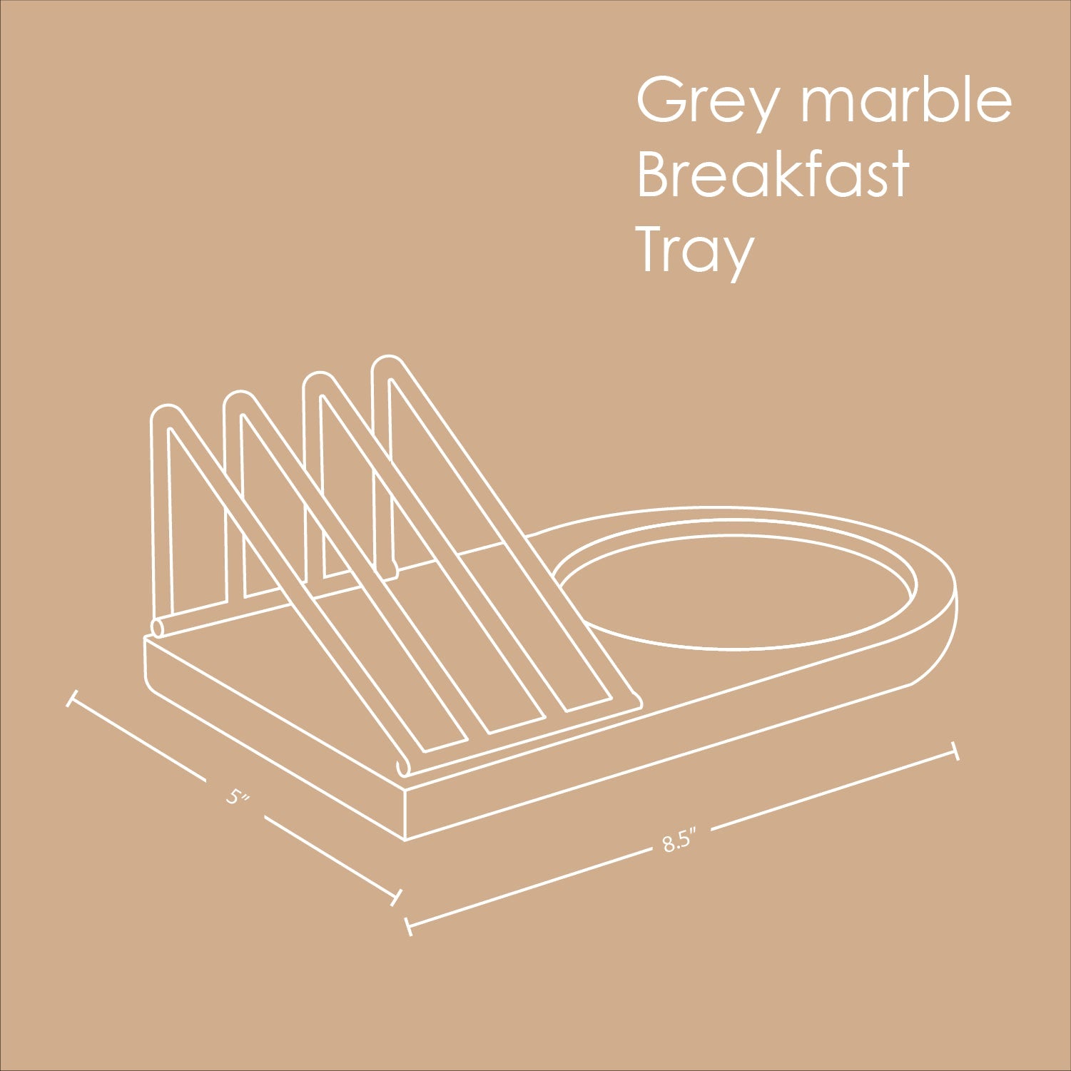 Indulge in a hotel-like breakfast experience from the comfort of your own home! Customize your tray with butter, jam, eggs, cheese, or coffee in the dedicated serving space. The one-of-a-kind grey marble pattern with elegant swirls adds a touch of charm to this practical product. And who can resist the gold-accented toast stand? It's the cherry on top of this functional and fabulous tray!