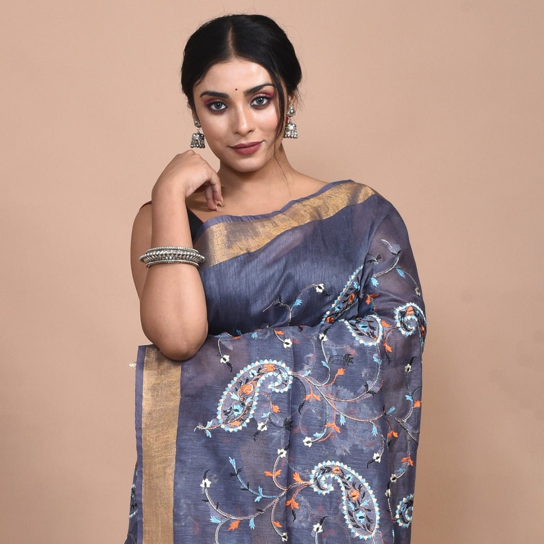Stotra Grey Paisley Design Embroidered Linen Saree