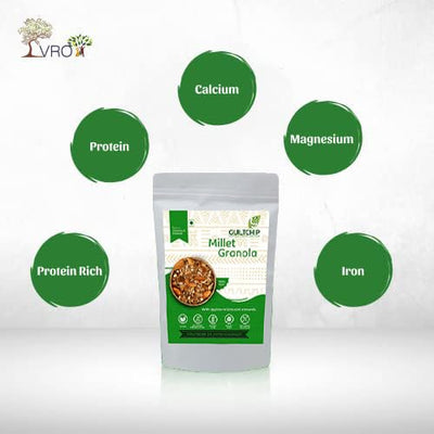 V R Organics ready to consume Breakfast cereal and snack. The millet granola can be added to milk & this mixture added into a smoothie. Gluten free granola with the benefits of millets and amaranth. Healthy, Natural and Preservative free Granola for you everyday uses. Made with wholesome Dried Apples & Almonds. Granola is baked to perfection and the amaranth are cooked thoroughly and are softer in texture and bursting with flavours and the deliciousness and crunchiness of granola filled with tasty chips, sweet potato and almonds as an easy to eat cereal. Rich in nutrients, fibre, vitamins. Granola is the perfect cereal and also works as a great healthy Breakfast meal. Millet Granola is a storehouse of nutrients like fibre, proteins and complex carbs that mainly energise your body. The protein of the almonds and amaranth makes it a nutritional fulfilling breakfast cereal.