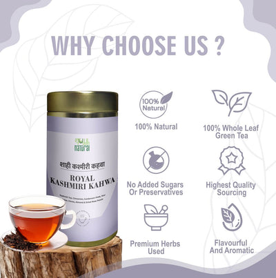 Signature Taste & Aroma: Our Kahwa is a harmonious infusion of antioxidant-rich green tea and exotic Malabar Coast spices, including Cinnamon, Cardamom, Cloves, Star Anise, and the exquisite luxury of Saffron. The blend is perfected with Himalayan Rose Petals and Crushed Almonds, offering warm, nutty, and spicy taste notes that are delicate on the palate.