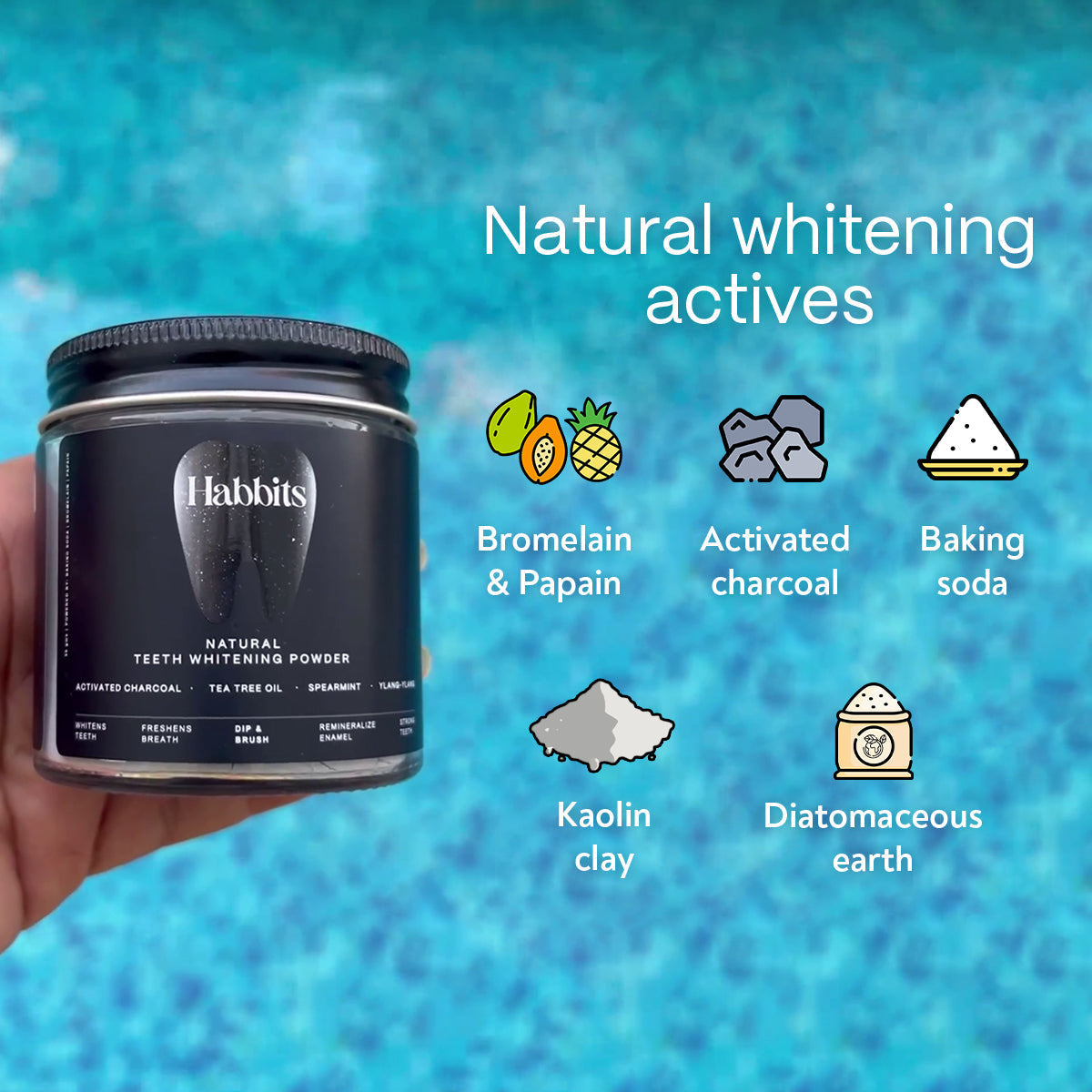 Teeth whitening powder is free from harmful toxins and is enamel safe, non-abrasive, and powered by bromelain, papain & sodium bicarbonate.