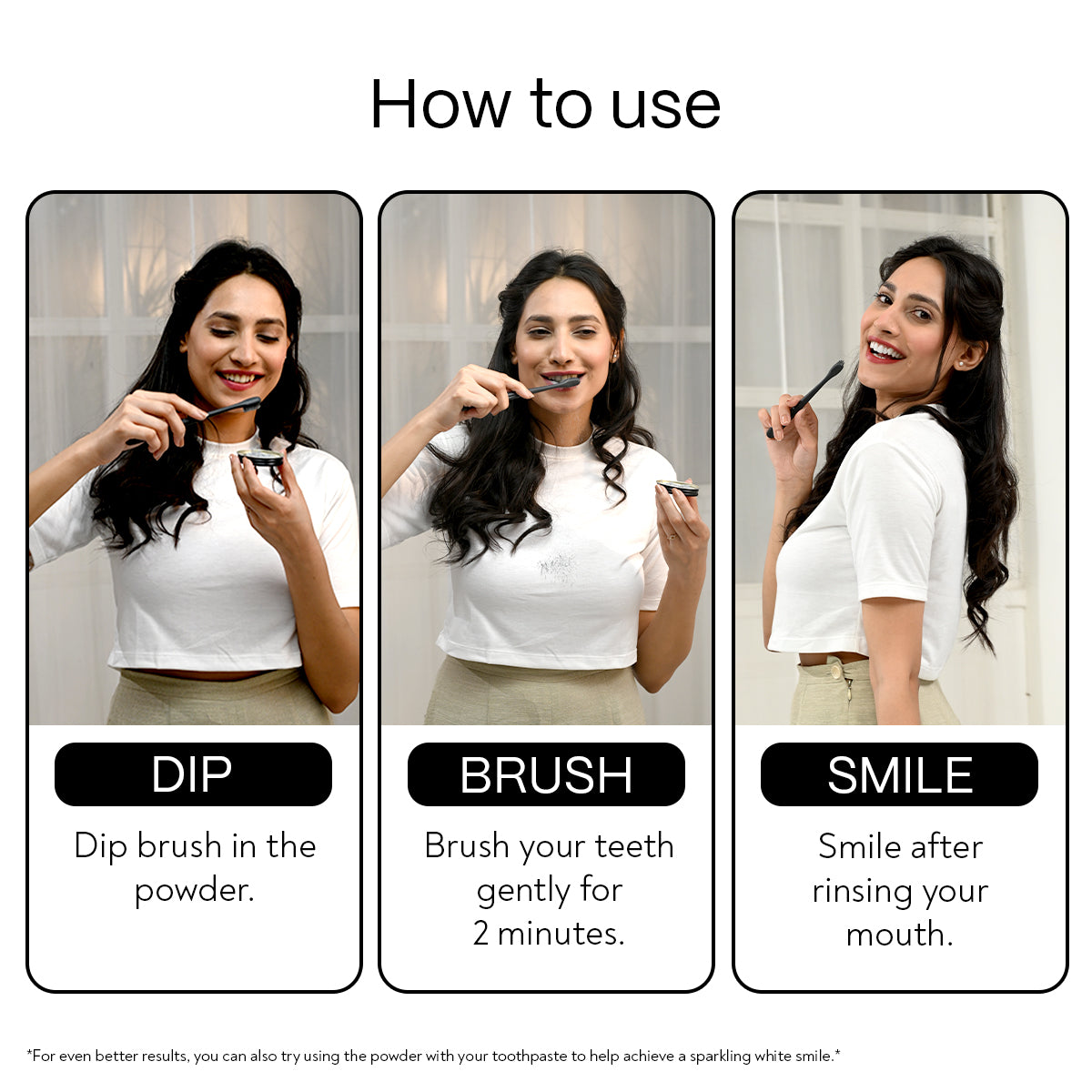For even better results, you can also try using the powder with your toothpaste to help achieve a sparkling white smile