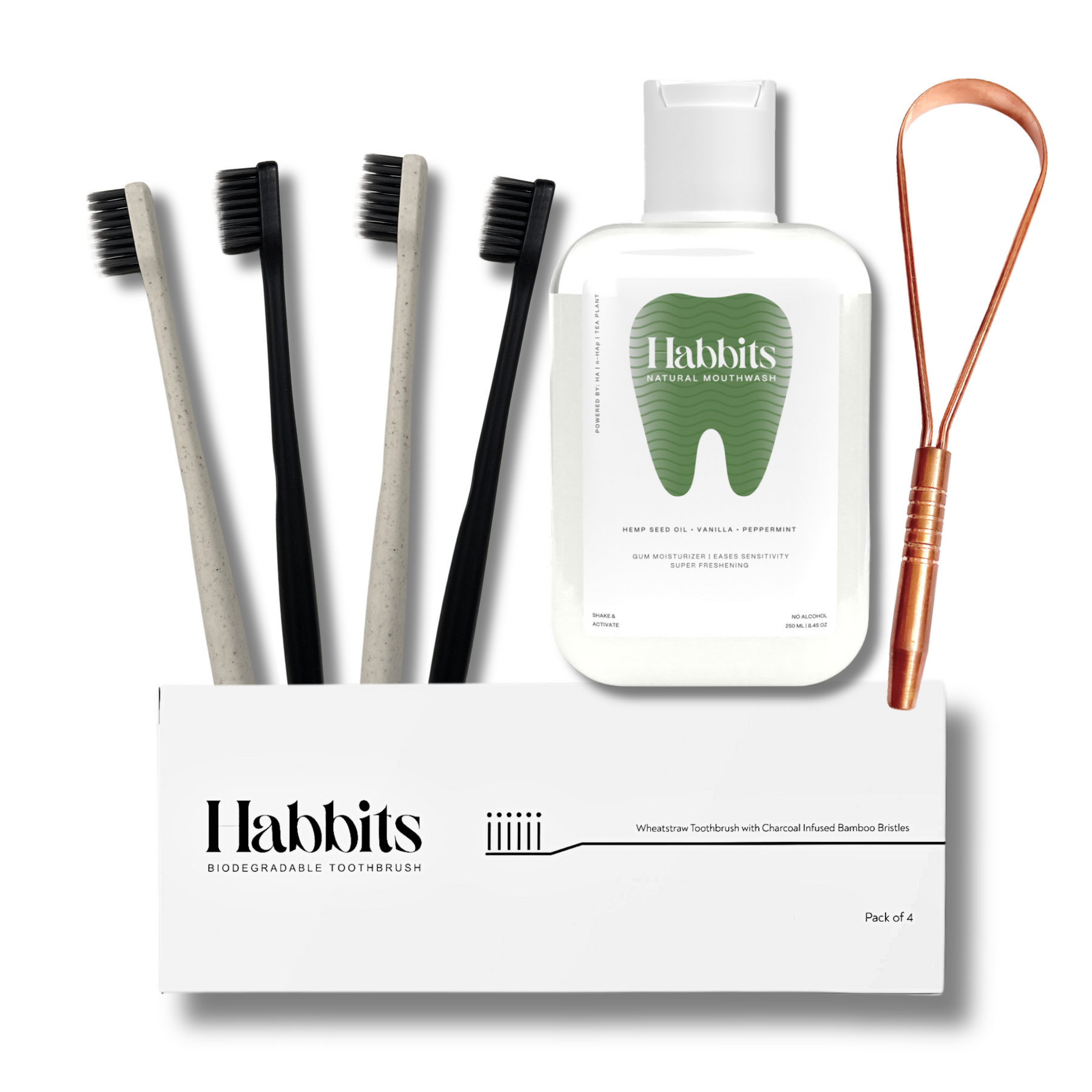 Habbits Natural Oral Care Bundle | Mouthwash + Copper Tongue Cleaner + 4 Biodegradable Wheatstraw Toothbrushes | Vitamin Enriched & Fluoride Free | SLS Free & FDA Certified | Pack of 3