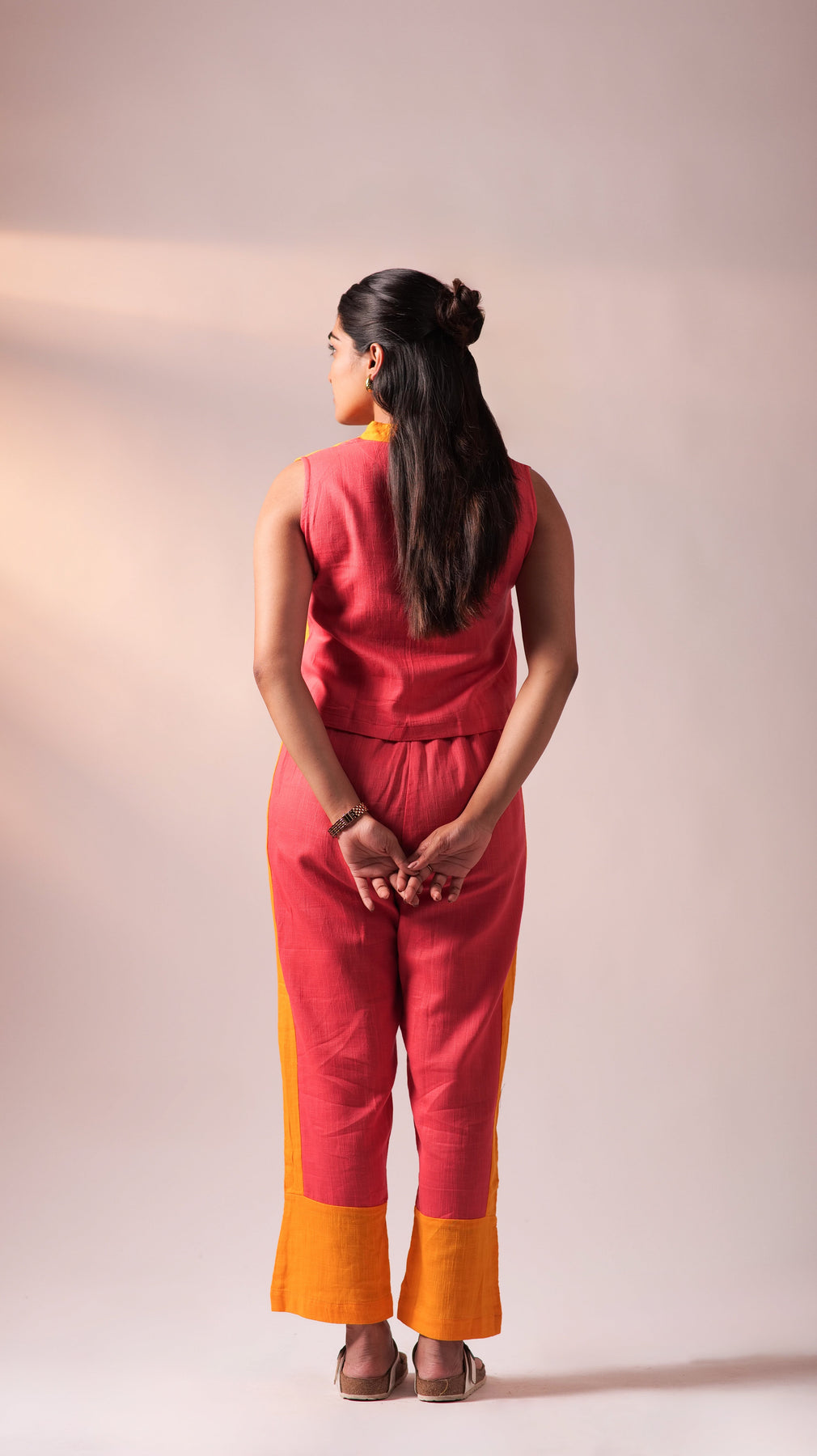 - The outfit stands out with a split design, showcasing pink and yellow hues that blend seamlessly, creating a playful and eye-catching contrast.