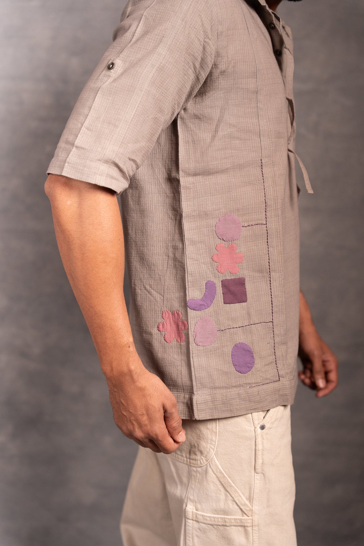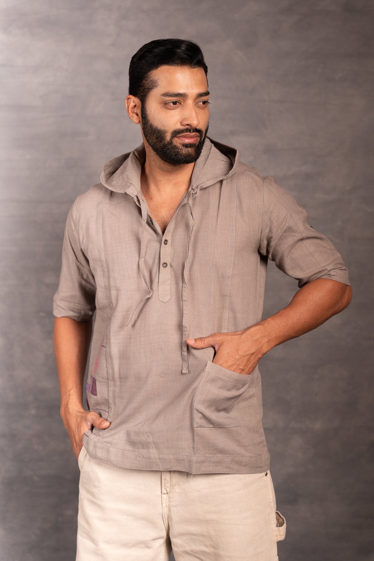 Half Sleeve Khadi Shirt with Hand-Applique & Hood
