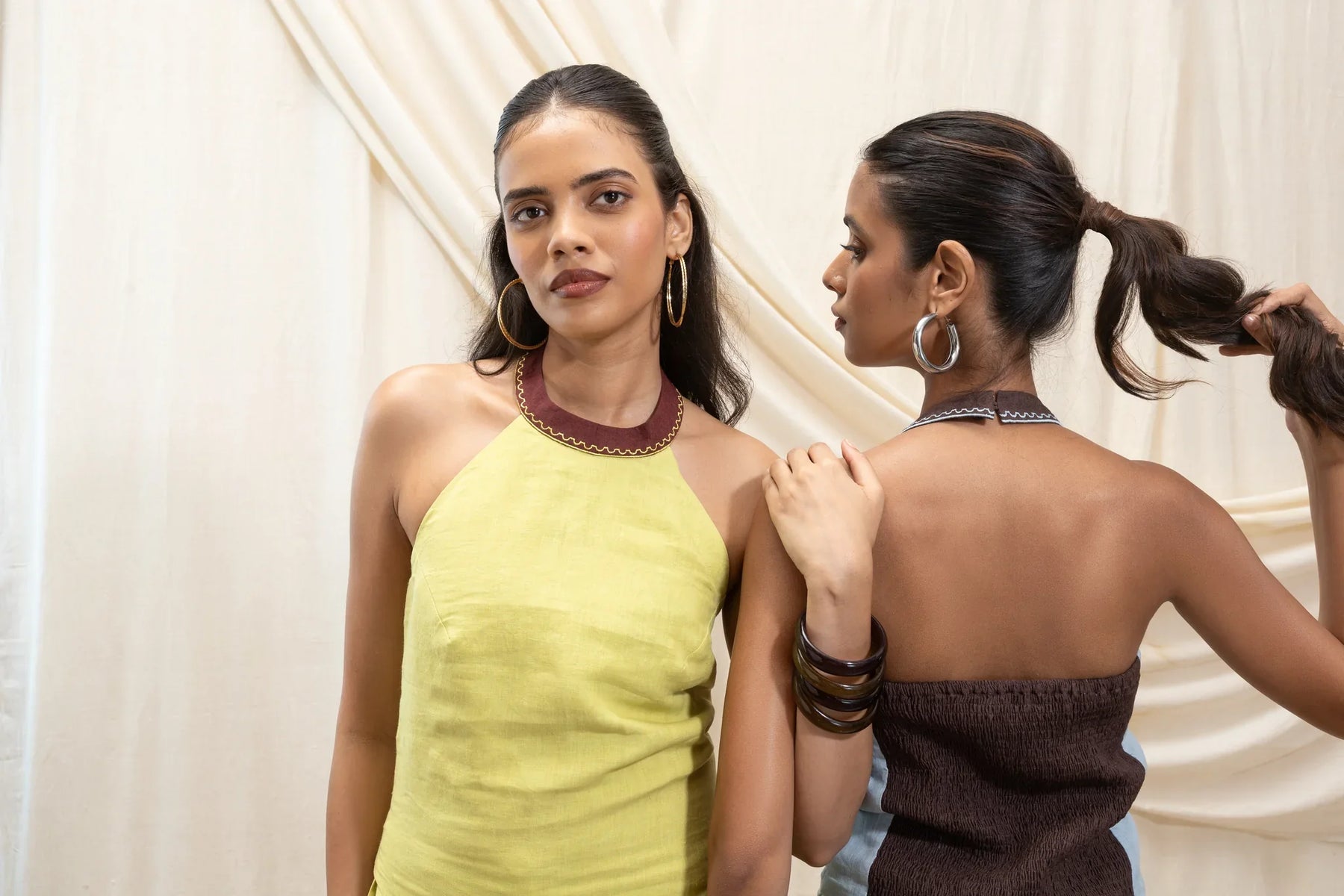 This halter neck top features a smocked back for a flattering fit and a secure button fastening at the neck. The V-cut hemline accentuates the waist, adding a structured yet effortless silhouette. The neckline is adorned with our signature line embroidery in a contrasting color, enhancing the overall design with a subtle yet striking detail.