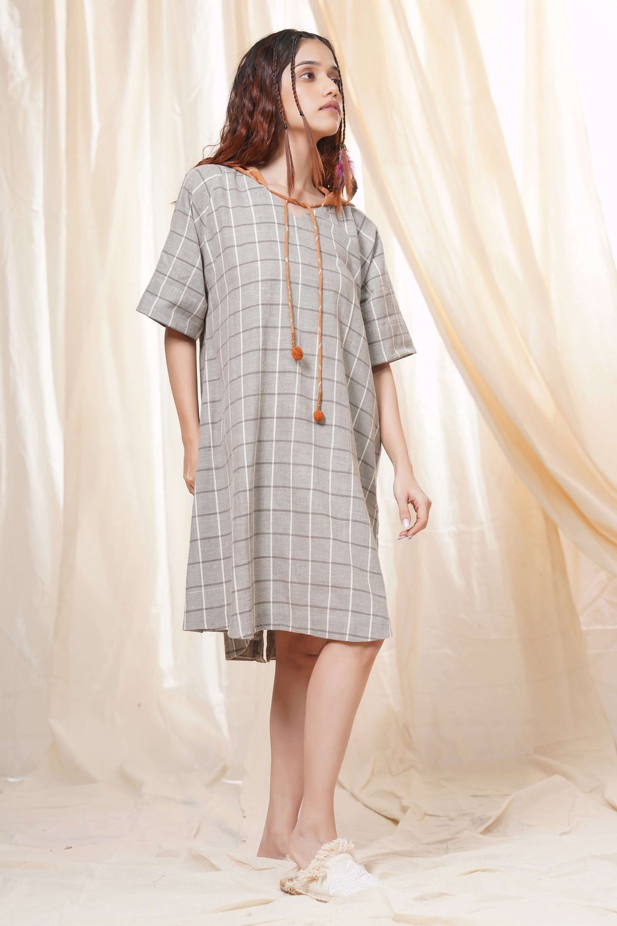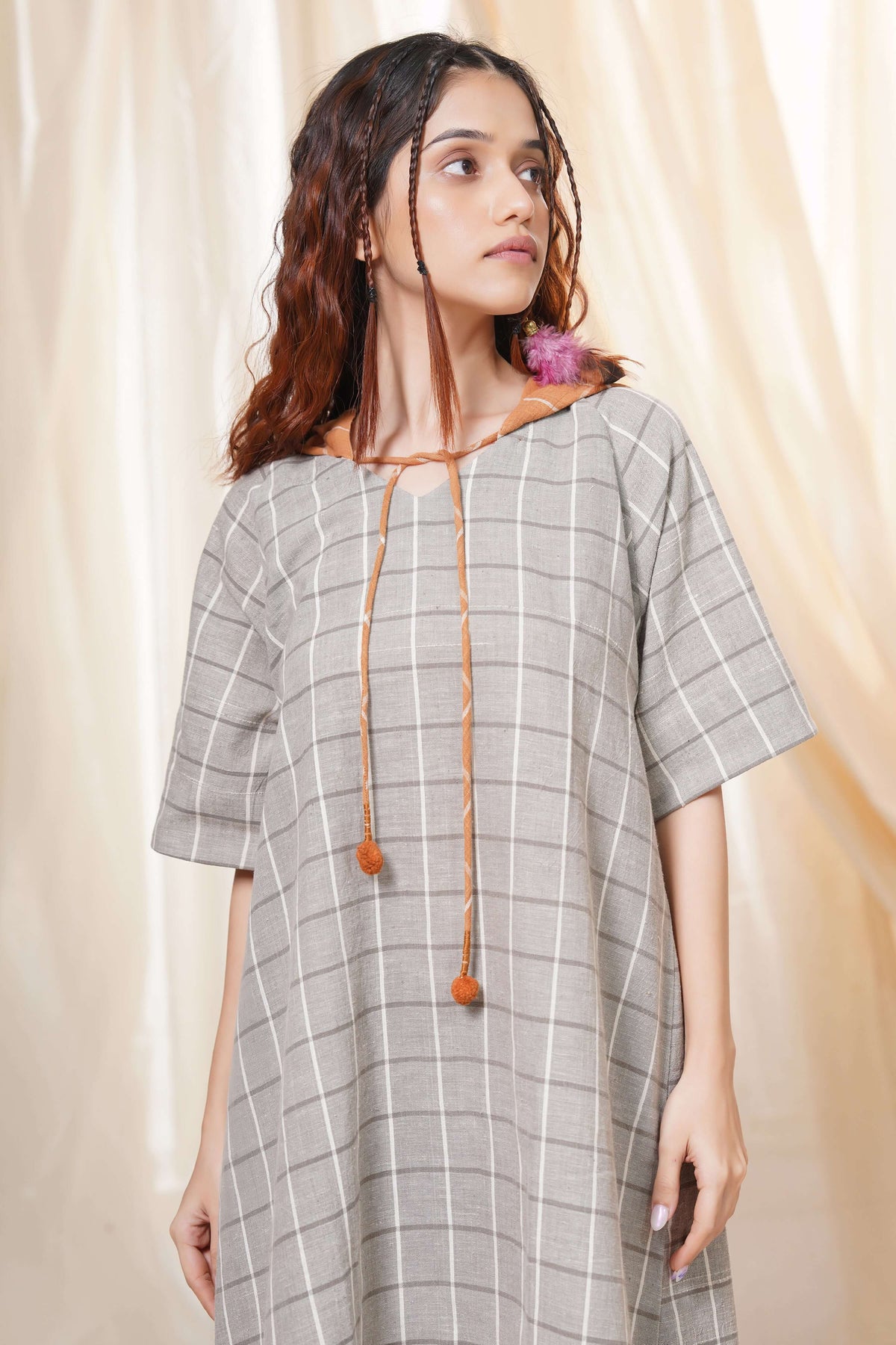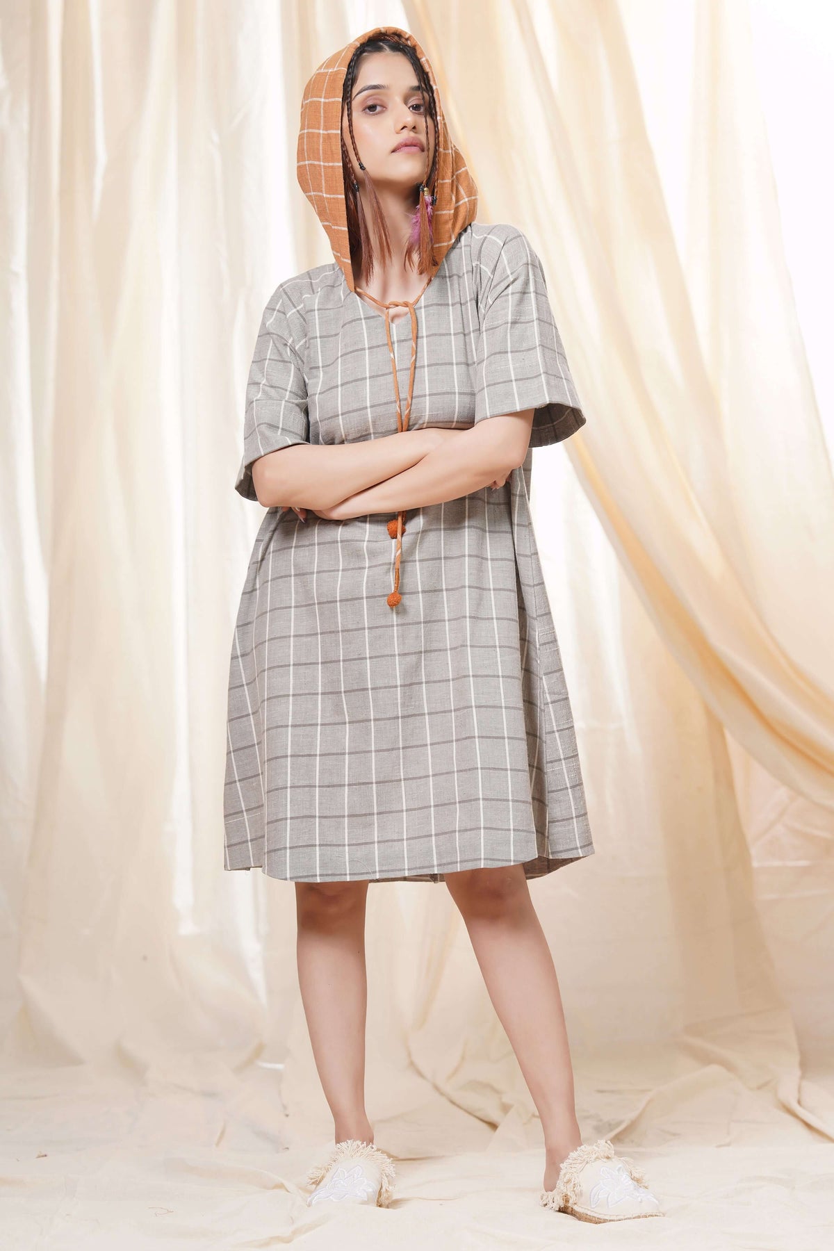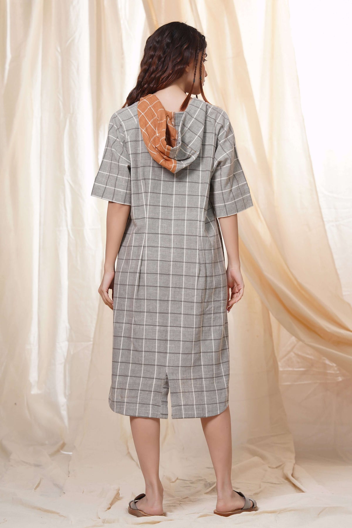 Created from hand spun and hand woven khadi, this product pays tribute to India's rich history in textiles. As soft as the embroidery on the artwork itself, the locally sourced artisans put in all their effort.Elevate your wardrobe with this Hand-Crafted Organic Khadi Hoodie Dress which is crafted from the purest and softest Khadi fabric available. The dress is elegantly checked gery which gives it a modern dye while blending contempory fashion with timeless craftsmanship. This dress is designed for comfort as the soft and loose fit along with the mid-length A-line will work for any occasion.