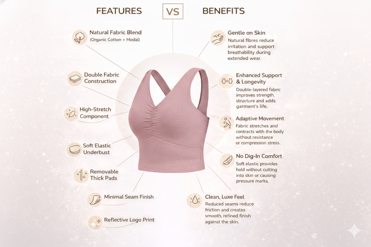 Crafted from a soft cotton-modal blend, this yoga bra offers a smooth, body-contouring fit that feels like second skin. The double-layered fabric provides gentle support, while removable pads allow customized comfort. Designed with a flattering V-neckline and subtle ruching detail, it balances function with feminine ease. Finished with minimal seams and reflective logo accents for a clean, elevated look - where movement meets modern elegance.
