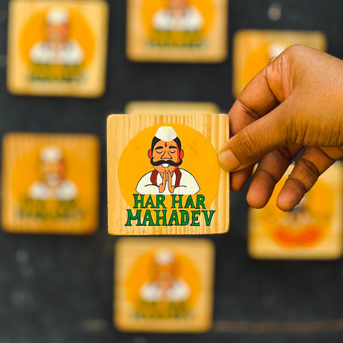 "Introducing Scrapshala's quirky fridge magnets, inspired by the spiritual essence of Banaras and featuring the ""Har Har Mahadev"" slogan. These magnets are handcrafted by talented artisans in Varanasi, ensuring each piece is unique and filled with positive vibes.