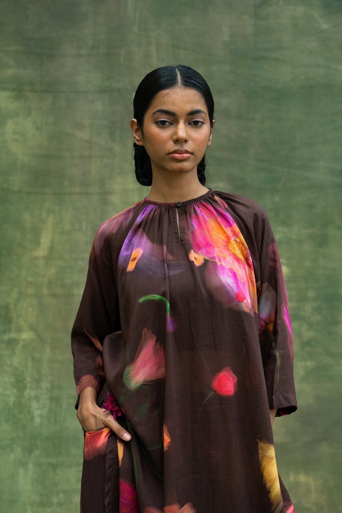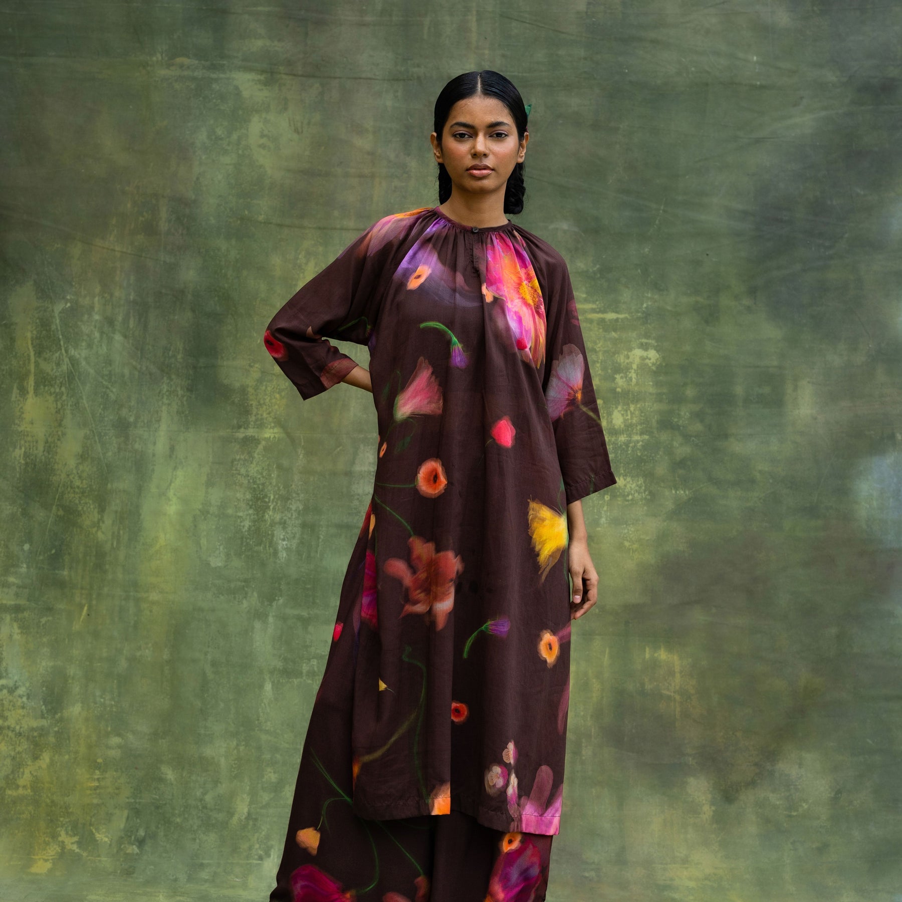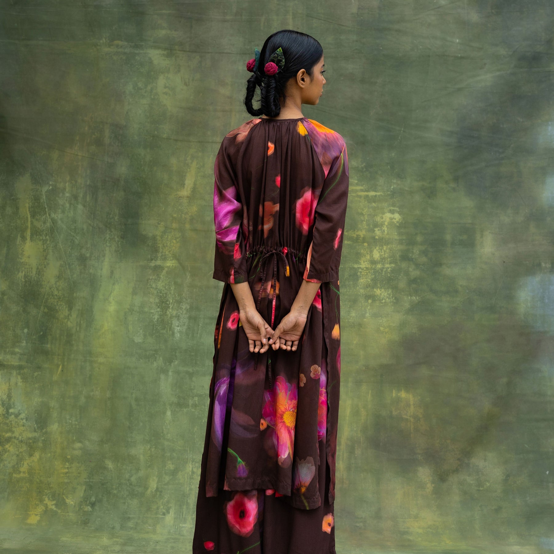 Gathered printed tunic with side slit and drawstring details at the back to adjust the fit of the tunic. With broad bottom elasticated pants.