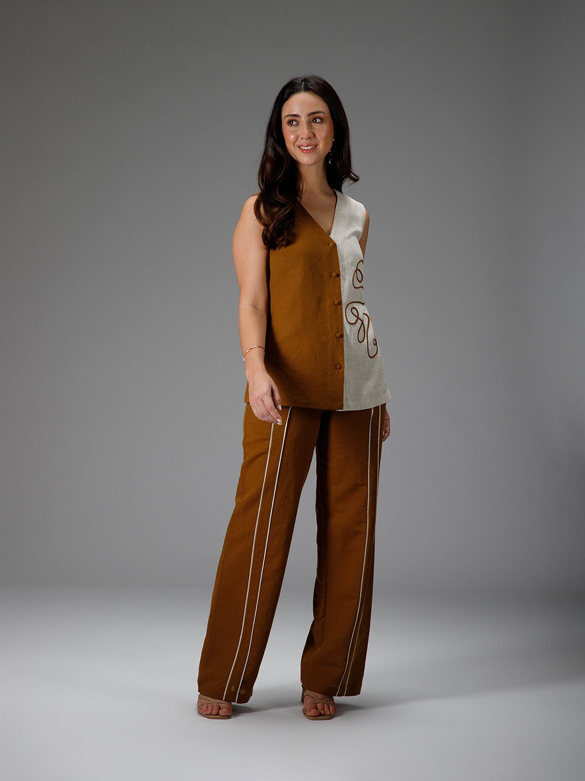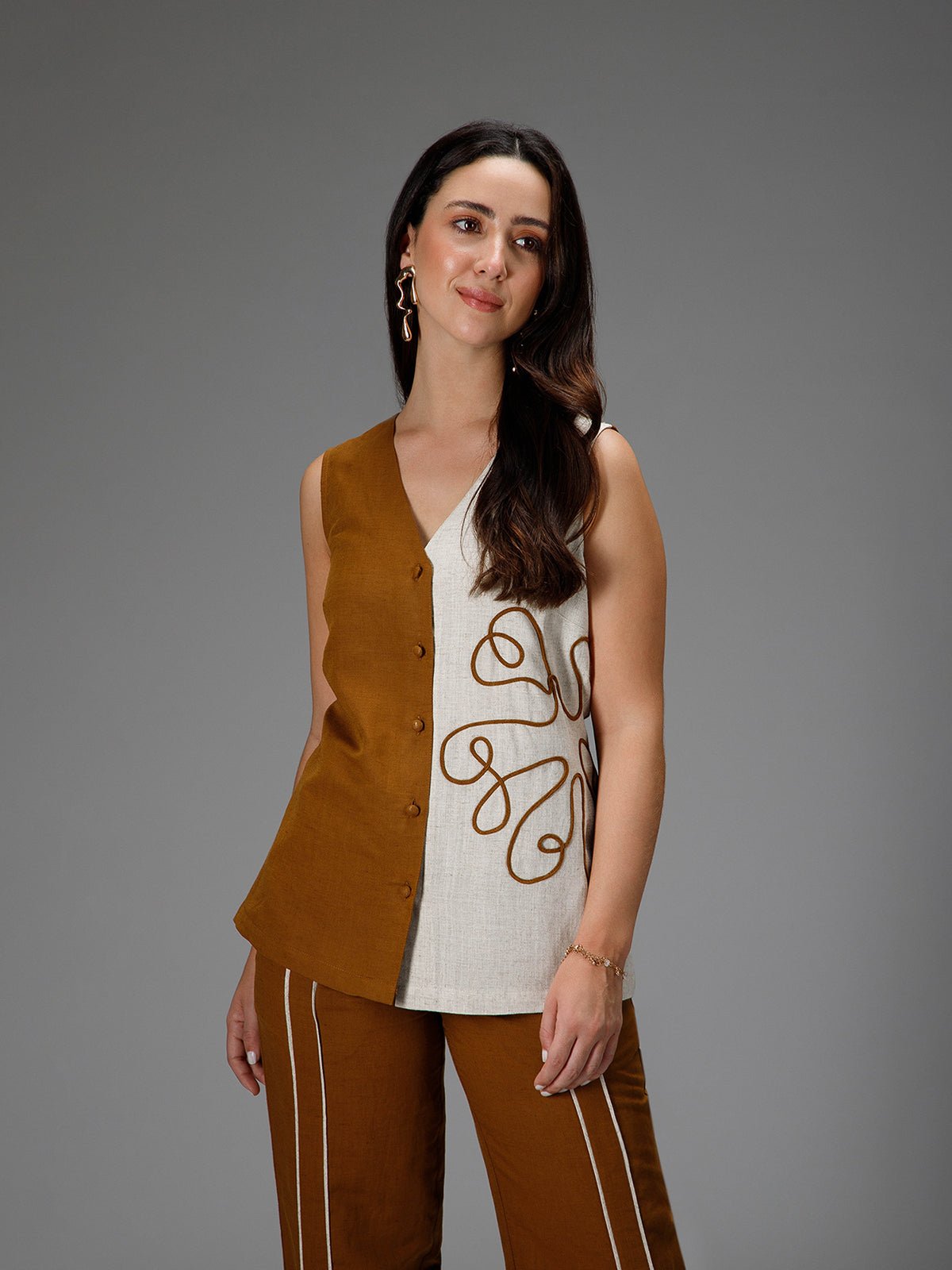 The Hazel Waistcoat brings effortless sophistication to your sustainable wardrobe. Crafted from a breathable cotton-linen blend, it features a camel and beige colorblock design enhanced with delicate cord embroidery, adding a subtle, thoughtful detail to a classic silhouette.