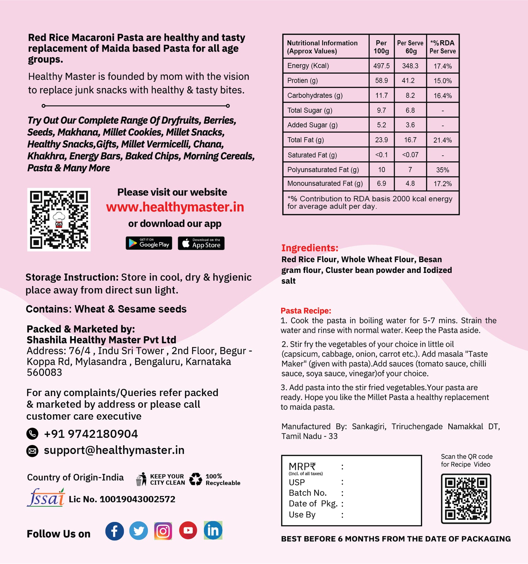 Healthy Master Red Rice Macaroni Pasta brings together the rich, earthy taste of red rice and the familiar comfort of classic macaroni. Made without maida, and blended with whole wheat flour, this dry pasta is vegan, preservative-free, and easy to cook. Its unique flavor and wholesome ingredients make it perfect for quick meals, lunchboxes, or creative pasta dishes. A delicious way to enjoy the natural goodness of red rice in your daily diet.