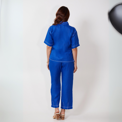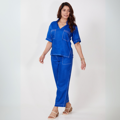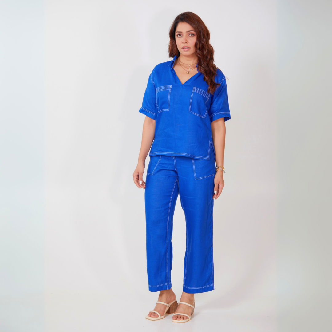 Introducing the CEO Set in Electric Blue or Azure, the most versatile set in your wardrobe. Made from 100% pure hemp, this ensemble gets softer with every wash without losing its form. The set features stitch line detailing that adds a faux denim look, elevating the sophistication of the outfit.