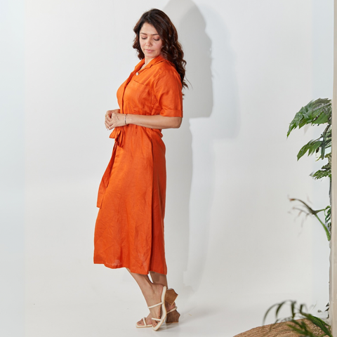 The Ember Maxi Dress, made with 100% hemp, features an elegant A-line silhouette and comes with an invisible belt loop. This vibrant burnt orange, or ember color, complements all skin tones and naturally gives a richer look.